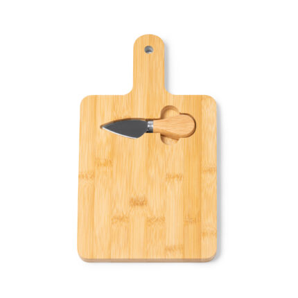 Tabla de cortar de bambú, incorpora un mango para un manejo cómodo. Incluye un cuchillo de acero inoxidable especial para quesos, ideal para preparar y servir con elegancia.