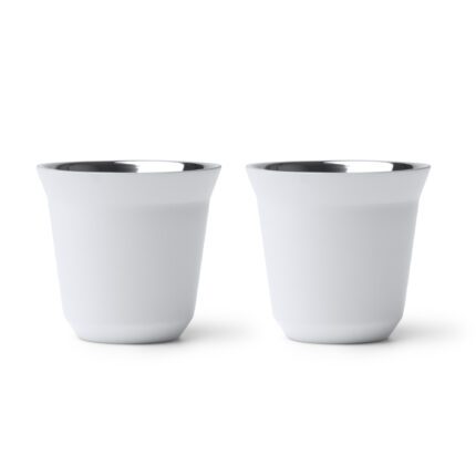 Set de 2 vasos para café elaborados en acero inoxidable 304 reciclado, con cuerpo en acabado mate y efecto espejo interior. Con capacidad para 80 ml cada una.