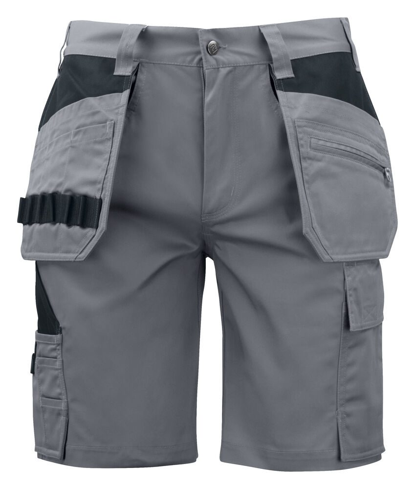 Pantalones cortos con bolsillos tipo funda que se pueden guardar en los bolsillos laterales, uno con un bolsillo adicional y otro con trabillas para herramientas. Bolsillos traseros con solapa y cierre de velcro. Bolsillo para cinta métrica y bolsillo con botón para herramientas. Dos trabillas para martillos, una a cada lado. Refuerzo en el interior del bolsillo para cinta métrica y en el interior de los bolsillos tipo funda.