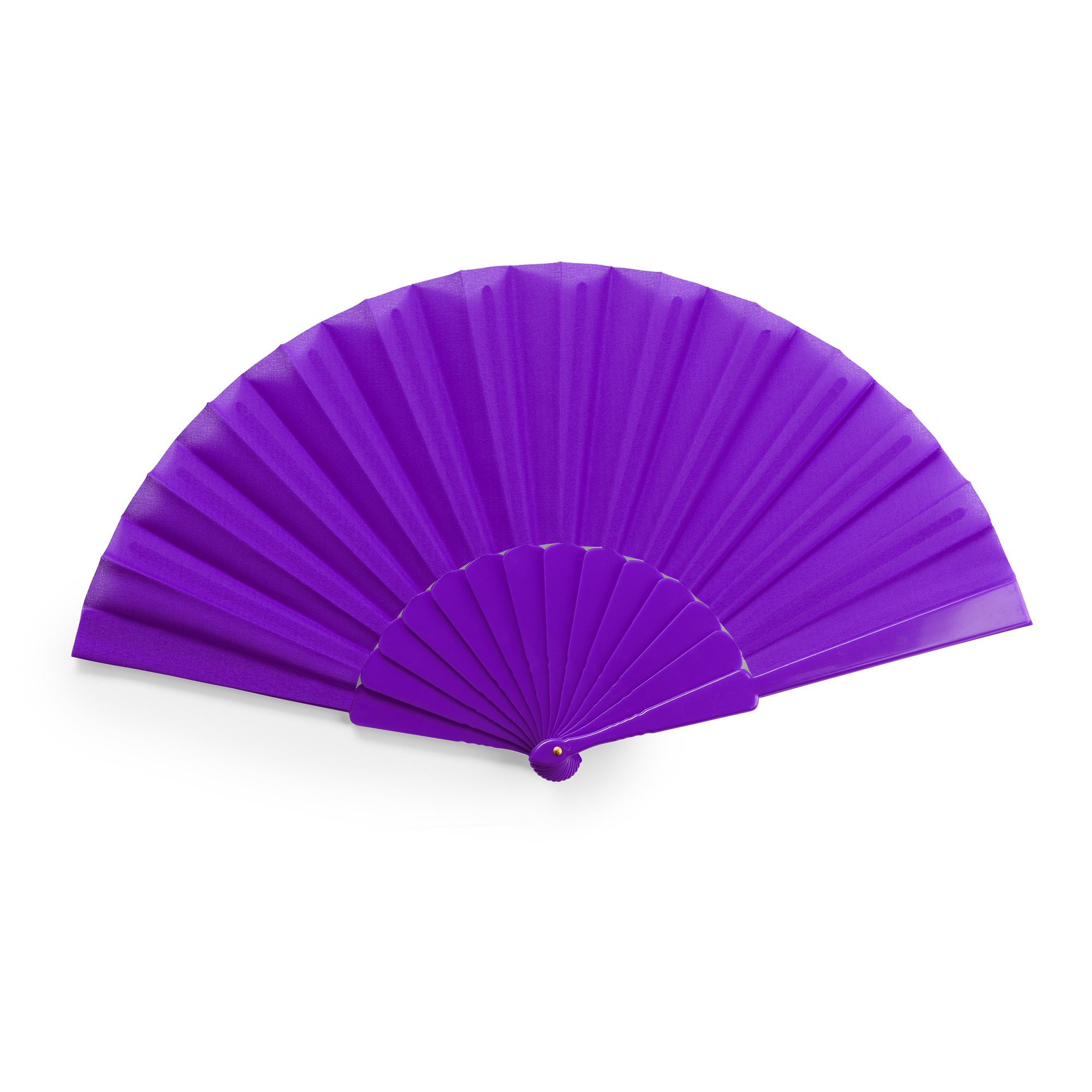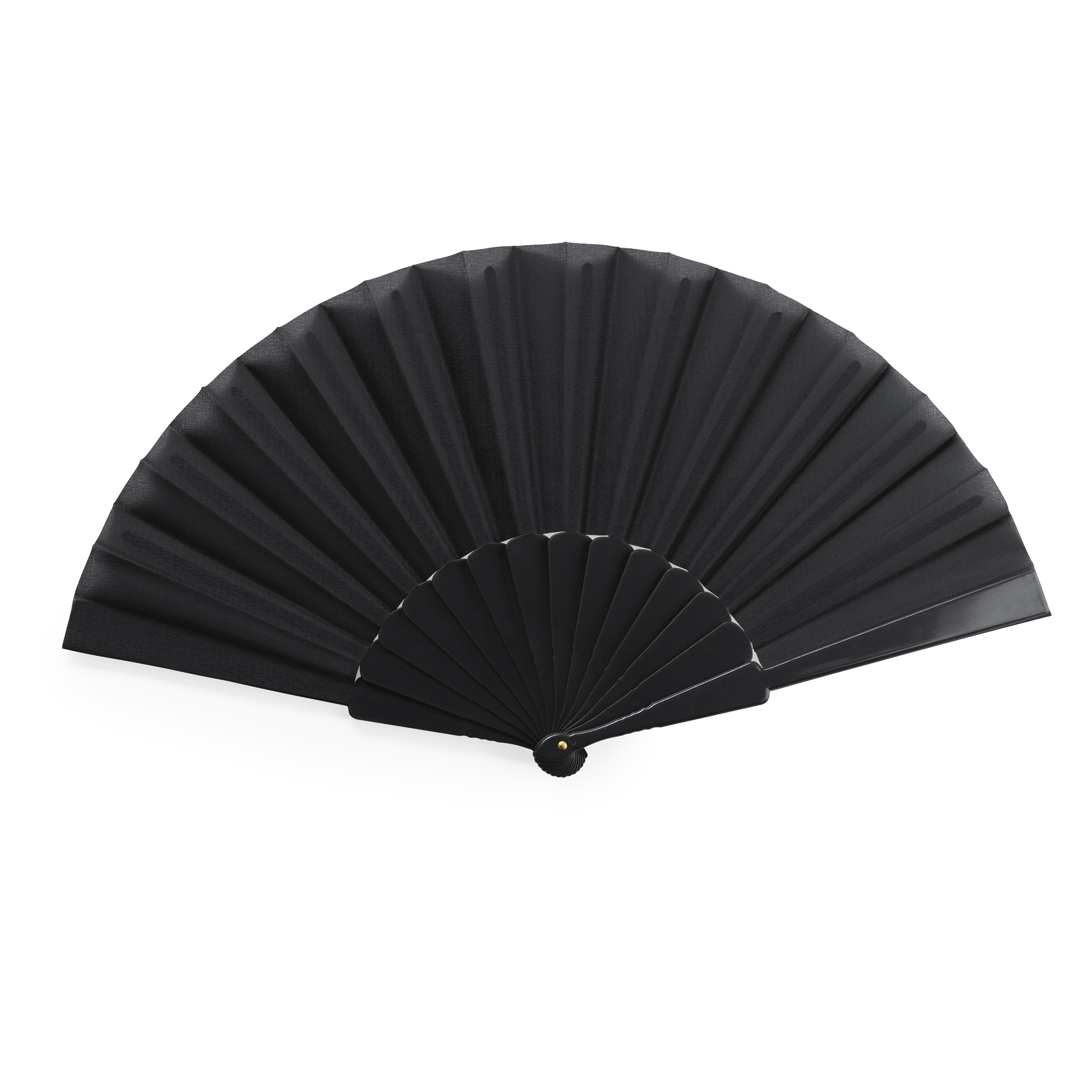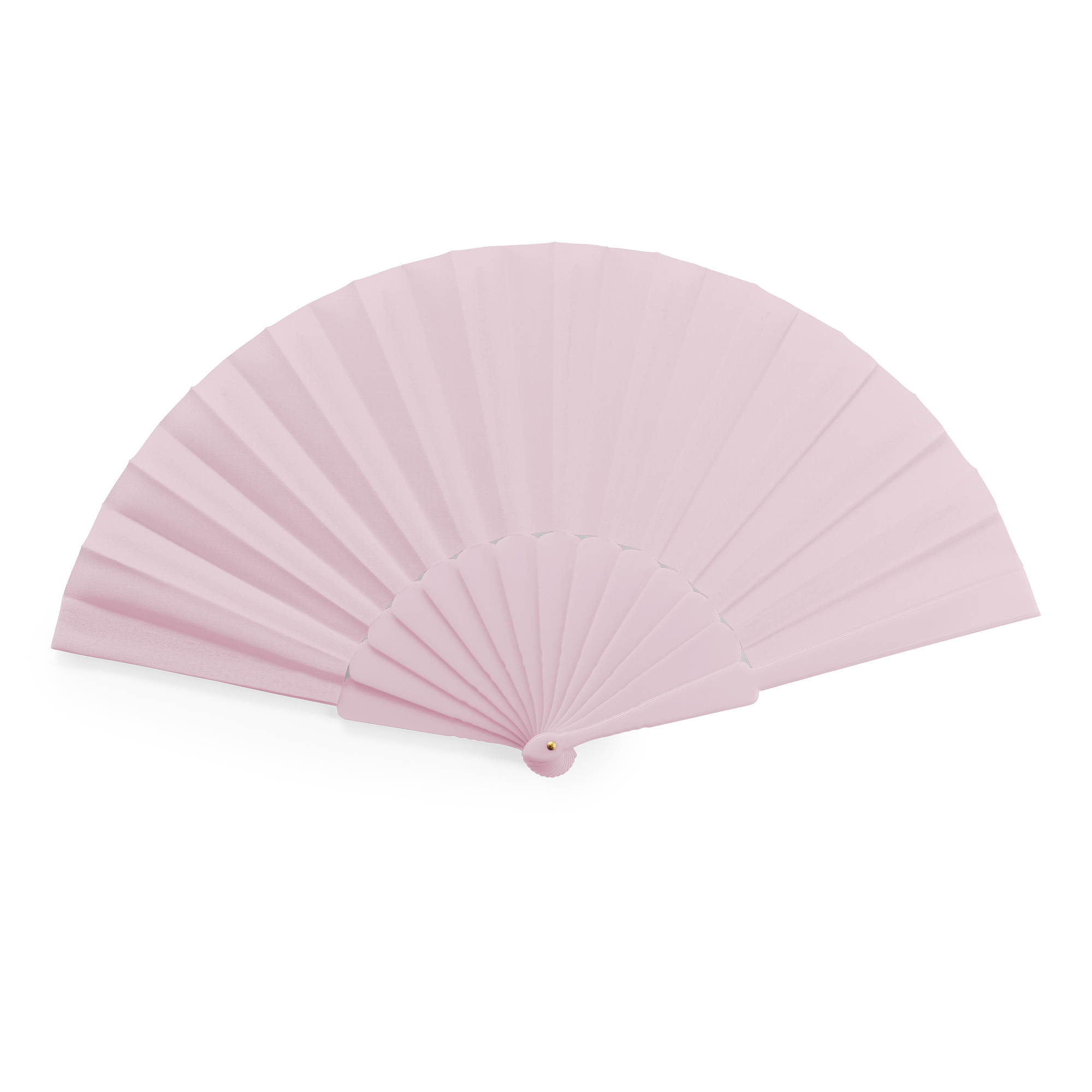 Abanico con varillas de plástico y tela en poliéster. Presentación en caja blanca.