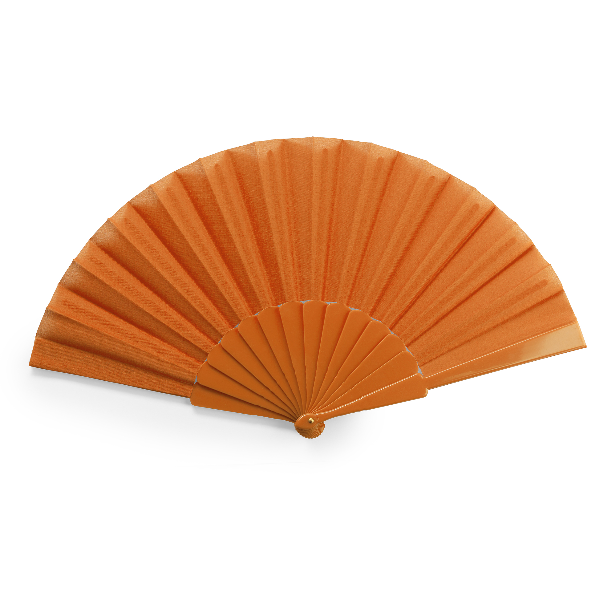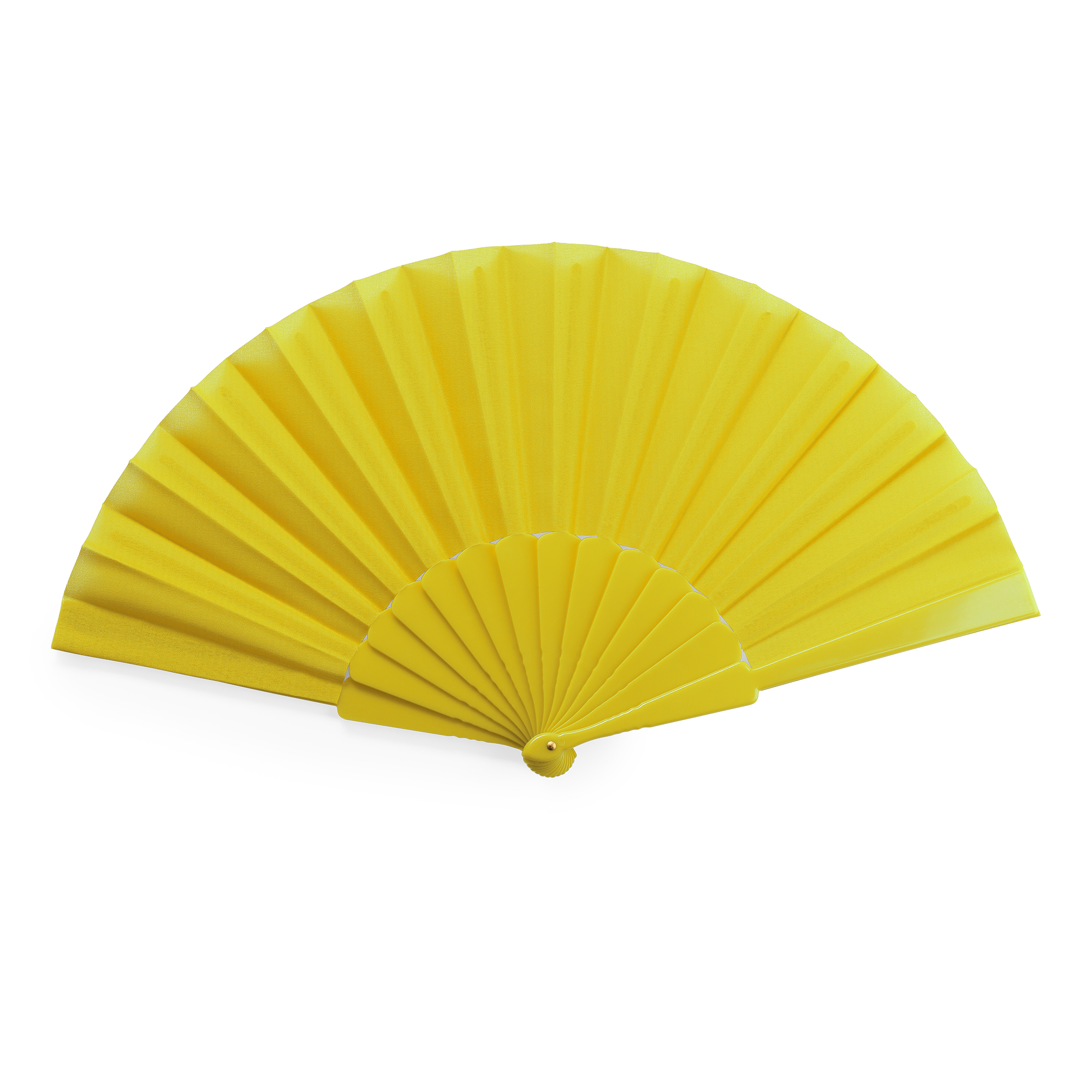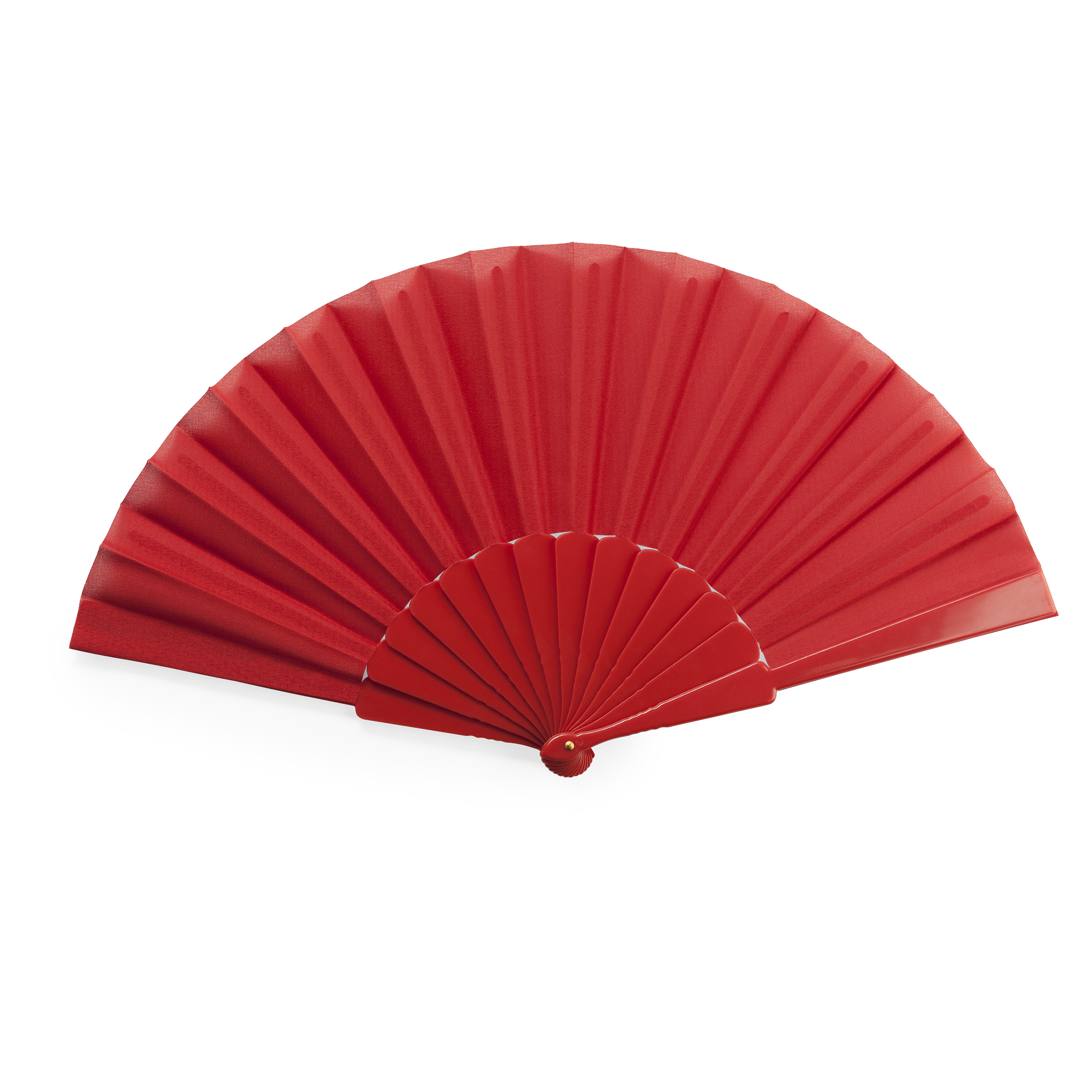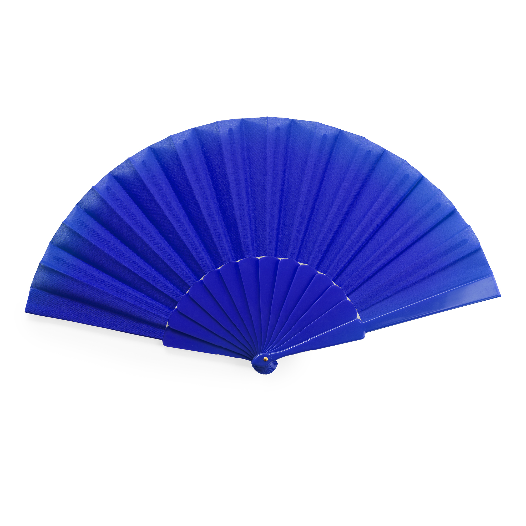 Abanico con varillas de plástico y tela en poliéster. Presentación en caja blanca.