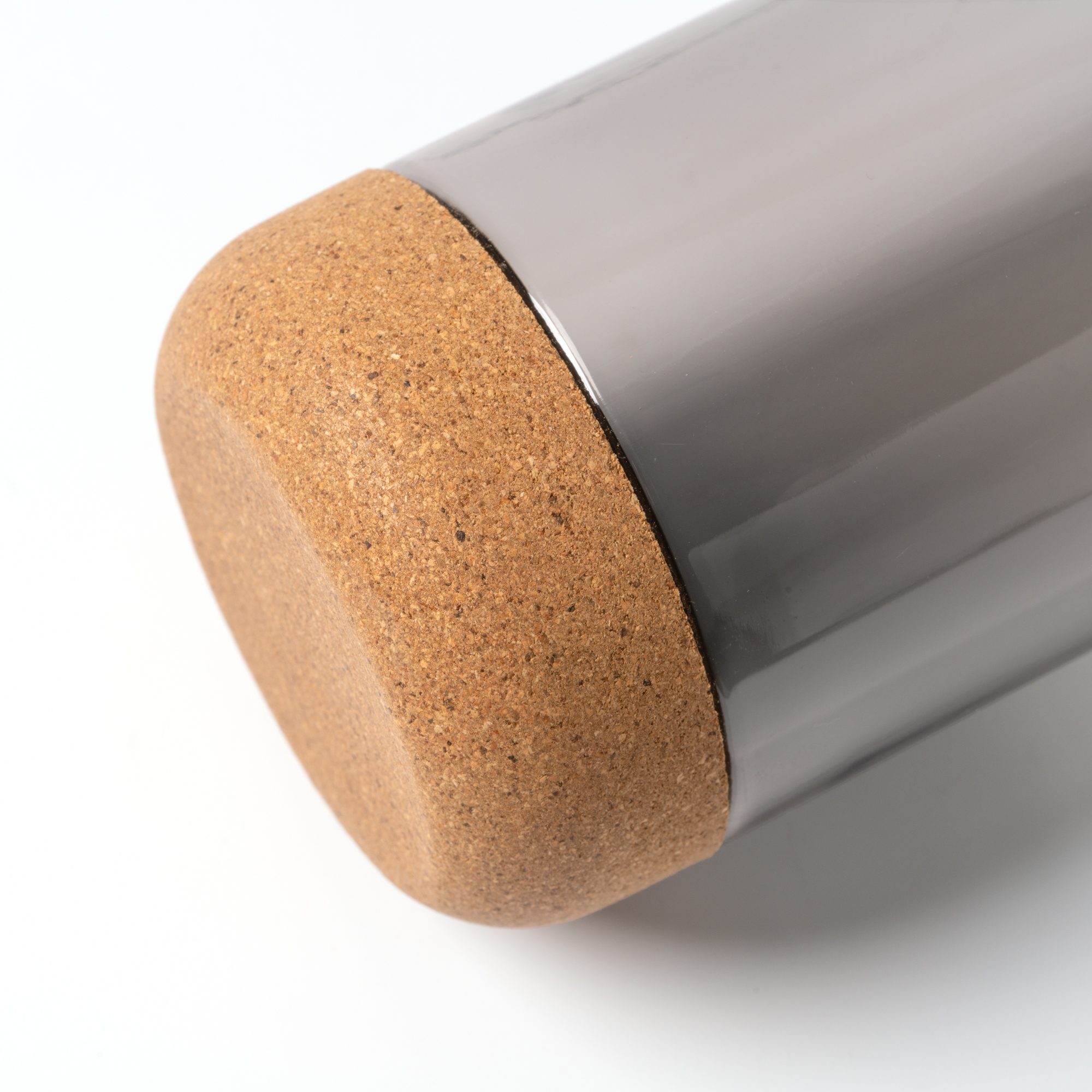 Botella con cuerpo de RPET y base de corcho. Asa de transporte con función mosquetón en la tapa, para facilitar su transporte.
