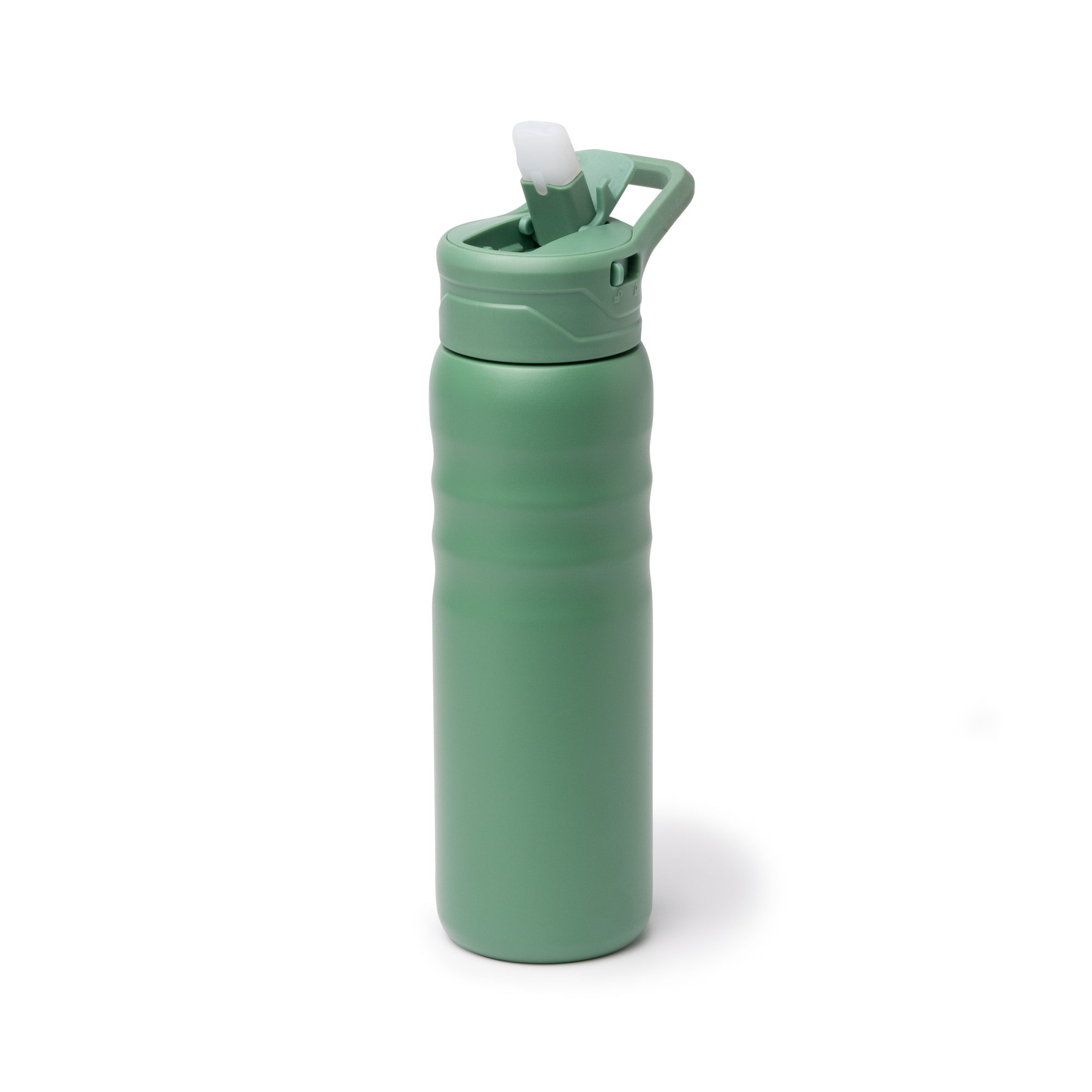 Bidón térmico elaborado en acero inoxidable reciclado 304 de doble capa. Con capacidad 710 ml. Tapa con pajita abatible con recubrimiento de silicona integrada con cierre individual y sistema automático de apertura mediante botón. Incluye, además, un bloqueo de la apertura de la esta tapa que cuenta con sistema antigoteo gracias a su recubrimiento de silicona y del anillo que incorpora el cuello del bidón. En la tapa además, se incluye su asa de transporte.