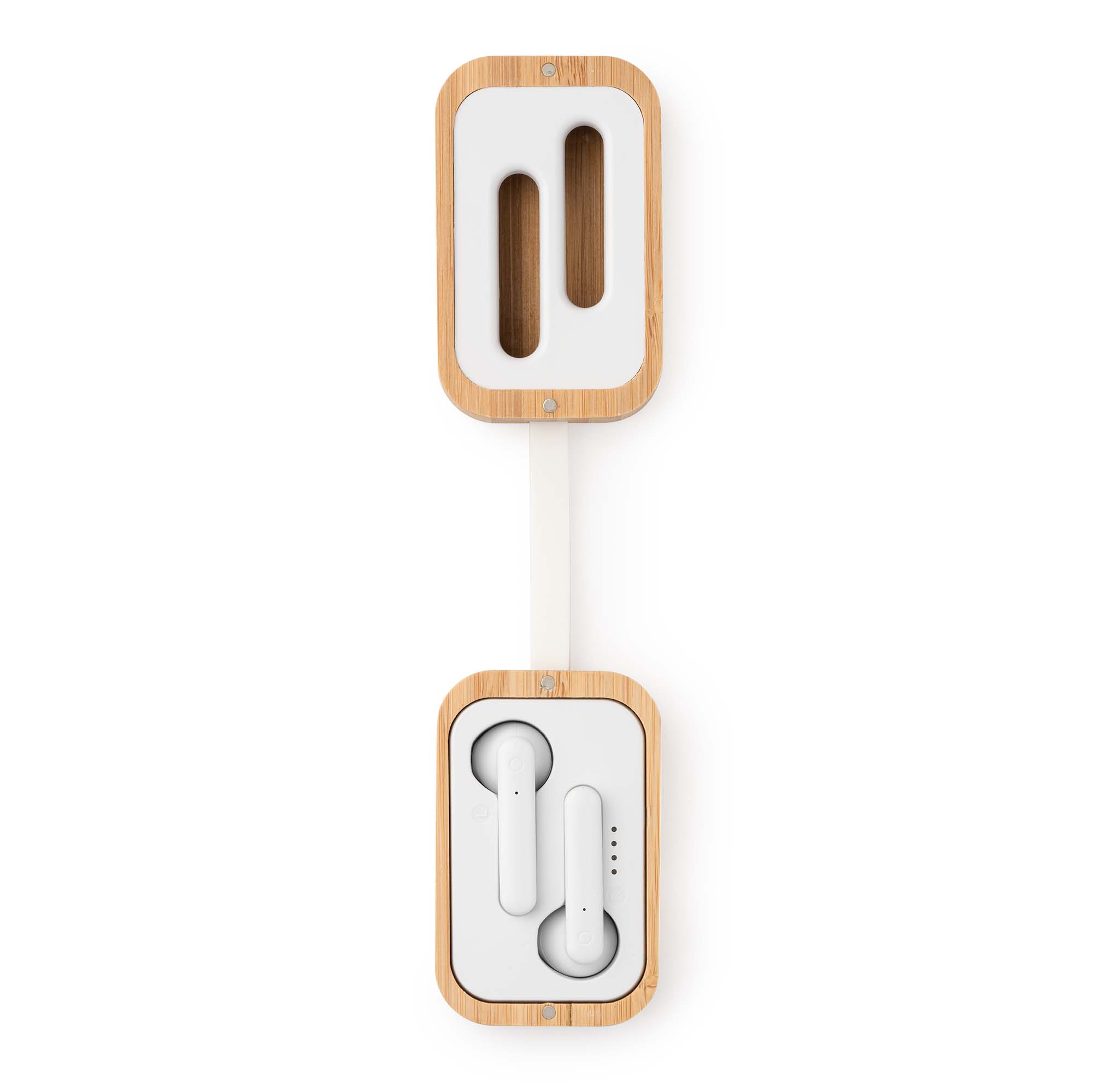 Auriculares inalámbricos con estuche elaborado en bambú. Con conexión Bluetooth y función de manos libres. El control de manos libres se puede realizar mediante botón táctil integrado en cada auricular. Cuenta con función de reproducción de audio con control de pistas y volumen.