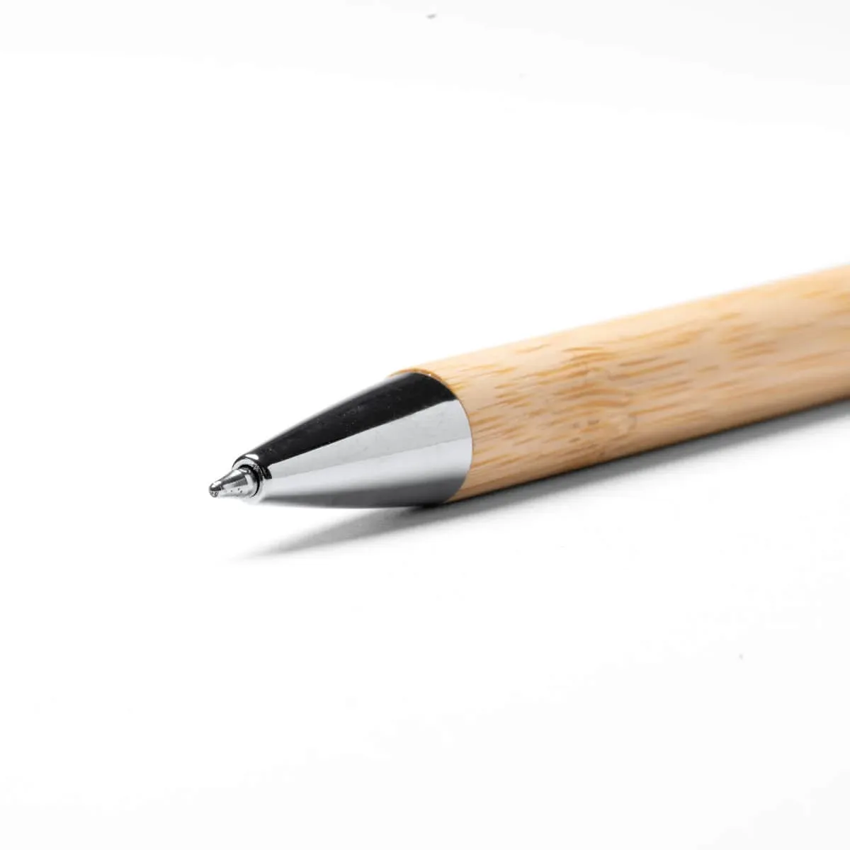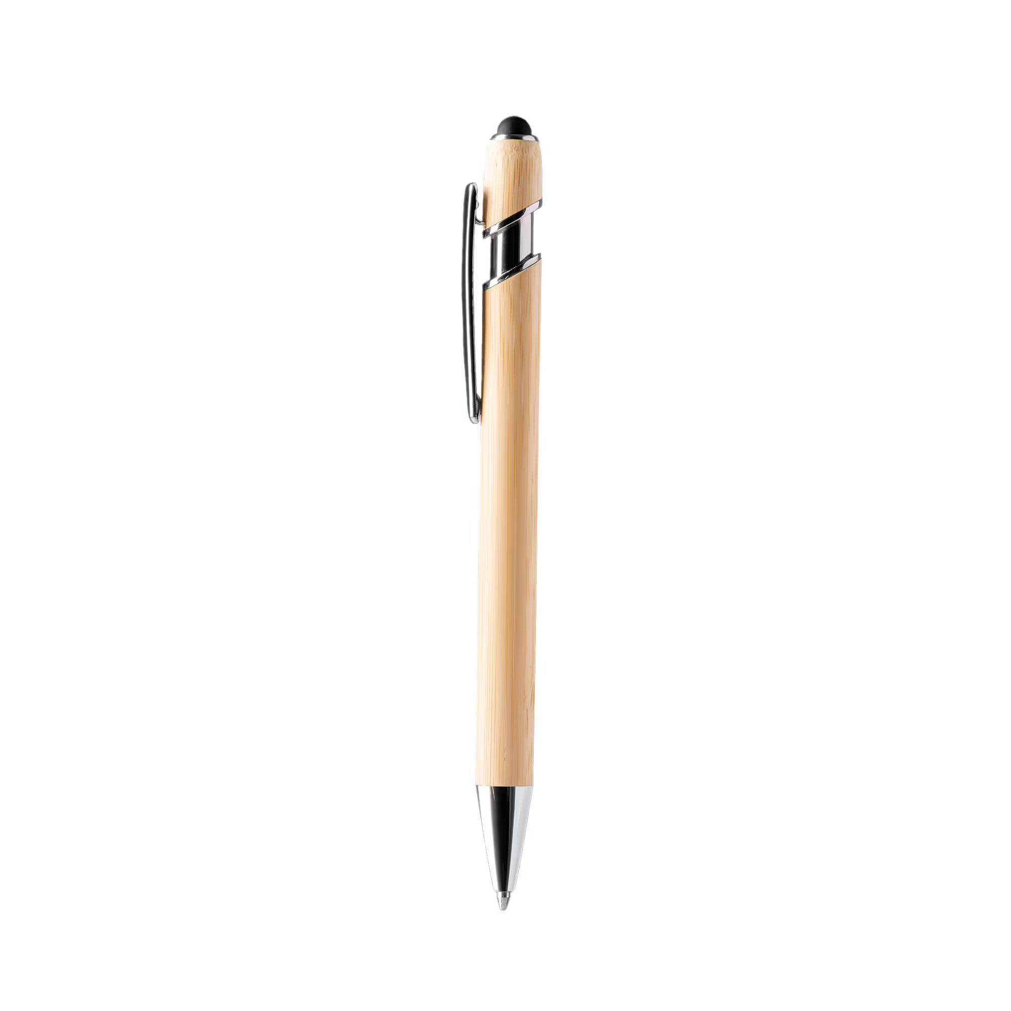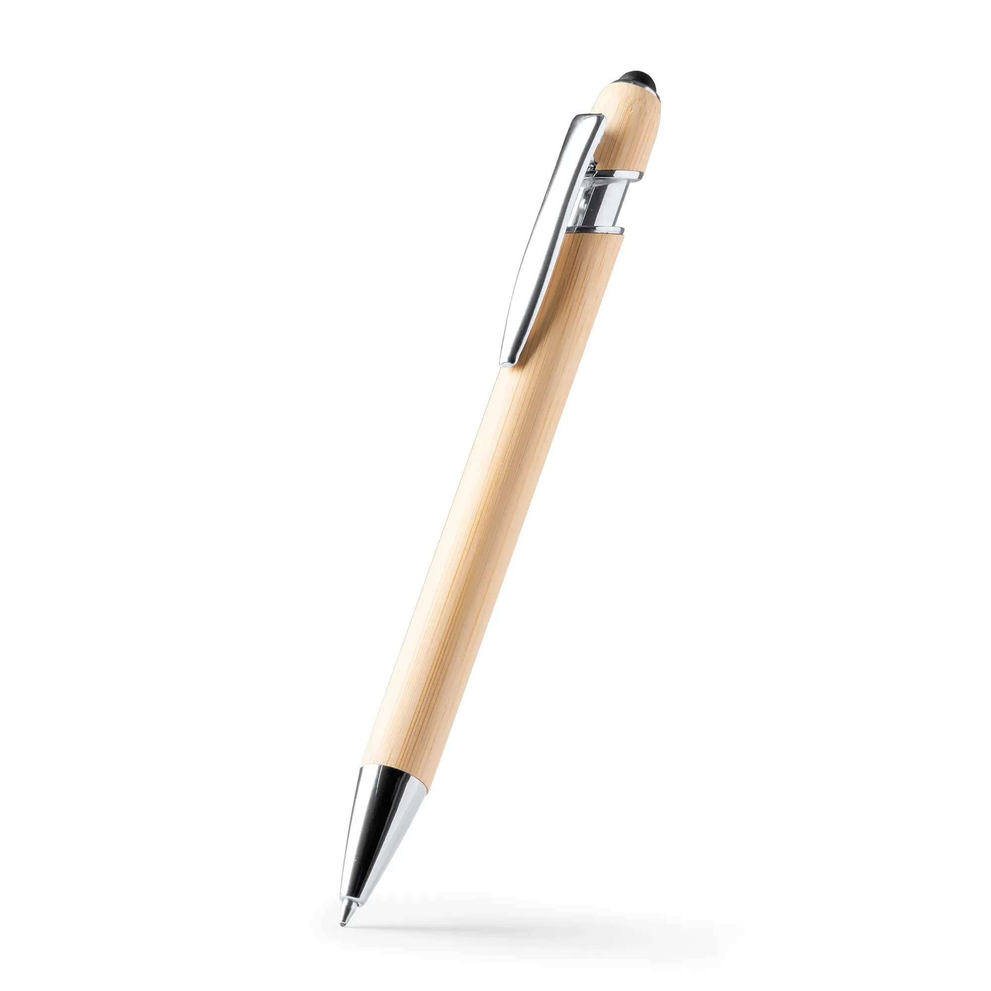 Bolígrafo con cuerpo elaborado en bambú y pulsador en acabado metálico. Con puntero táctil incorporado y mecanismo pulsador. Tinta azul.