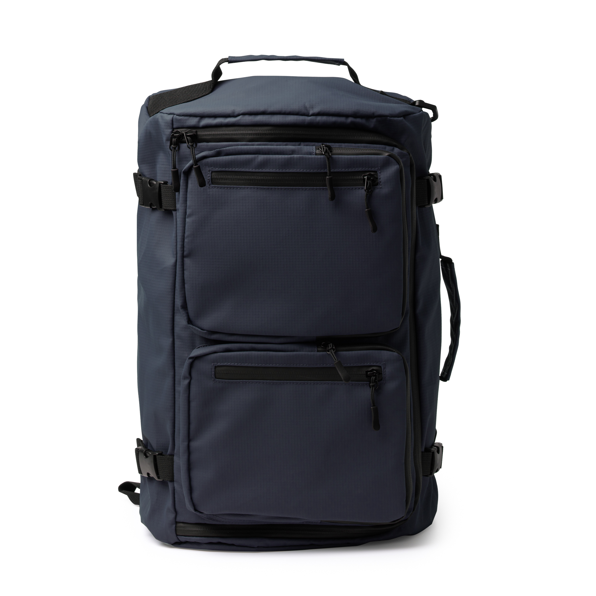 Bolso/mochila multifunción realizado en PU Leather con poliéster 600D Ripstop. Resistente al agua. Gran compartimento principal con apertura completa. Múltiples bolsillos exteriores. Compartimento para calzado. Asa reforzada. Todos los compartimentos cuentan con cremallera impermeable. Incluye cinta acolchada para hombros con funcionalidad de mochila.