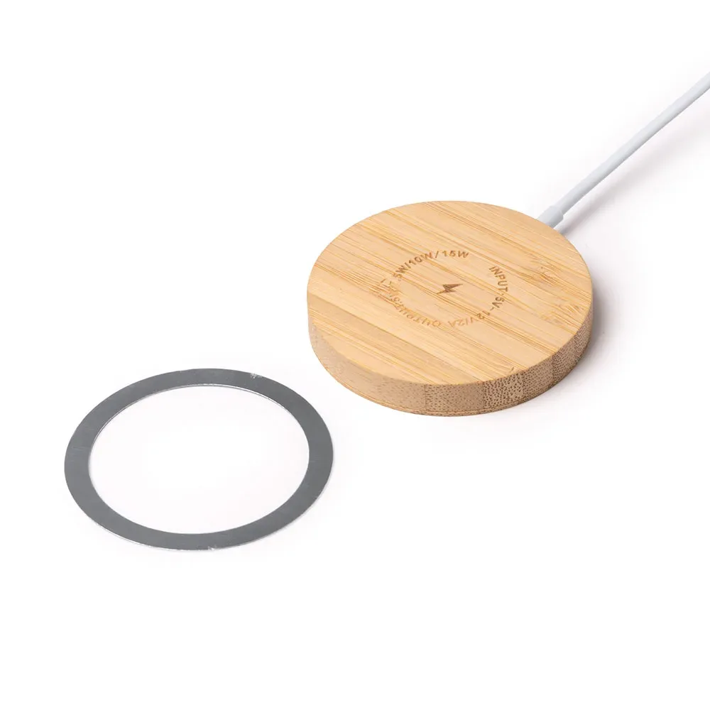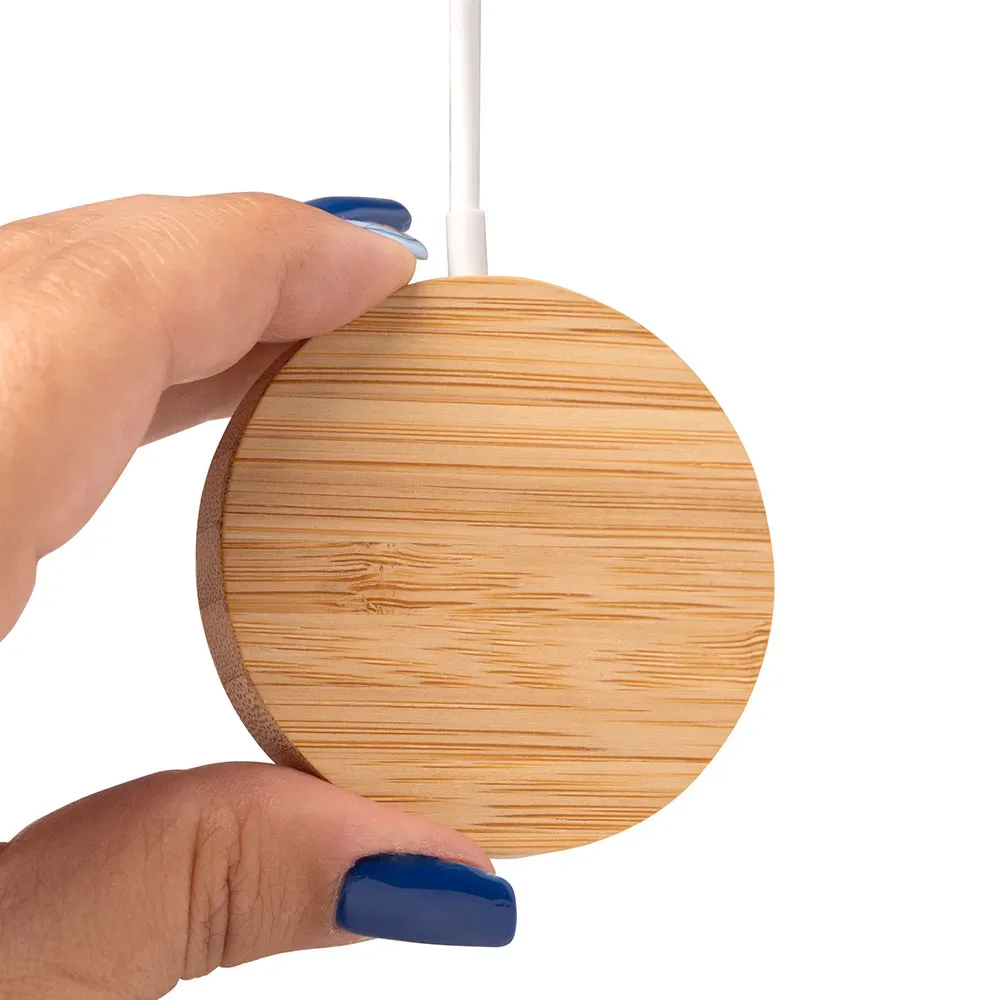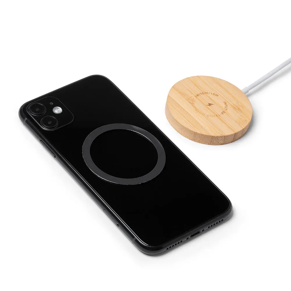 Cargador inalámbrico elaborado en bambú. Con función magnética en superficie mediante anillo magnético. Potencia de carga de 15W. Compatible con dispositivos provistos de tecnología de carga inalámbrica. Incluye anillo accesorio adhesivo. Cable de conexión Tipo C integrado el cuerpo.