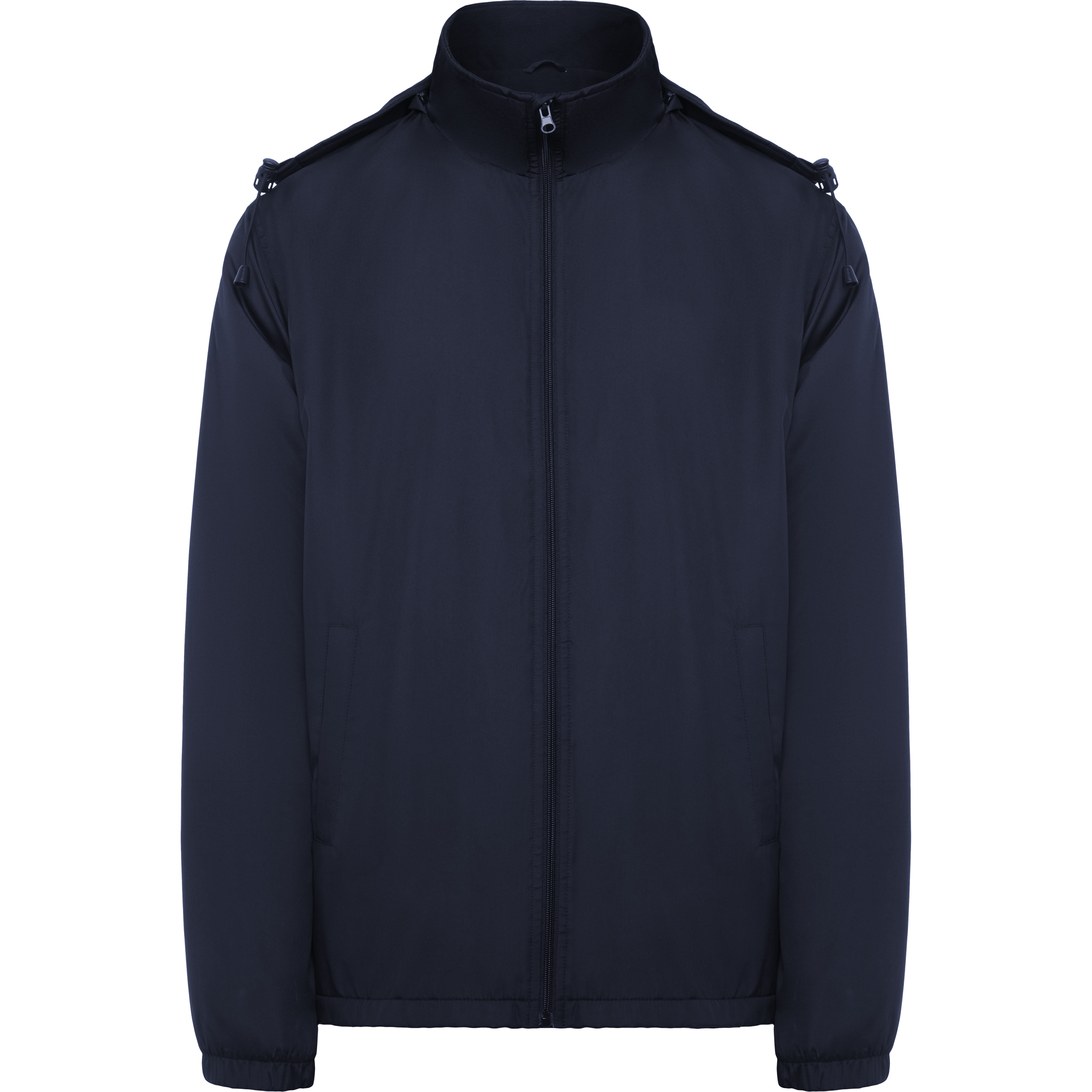 Chaqueta ligera repelente al agua. Cuello alto y capucha extraíble con ajustadores. Forro interior micropolar. ·Cremallera frontal y protector de barbilla. Puños elásticos. Dos bolsillos laterales con cremallera y un bolsillo interior en pecho izquierdo.