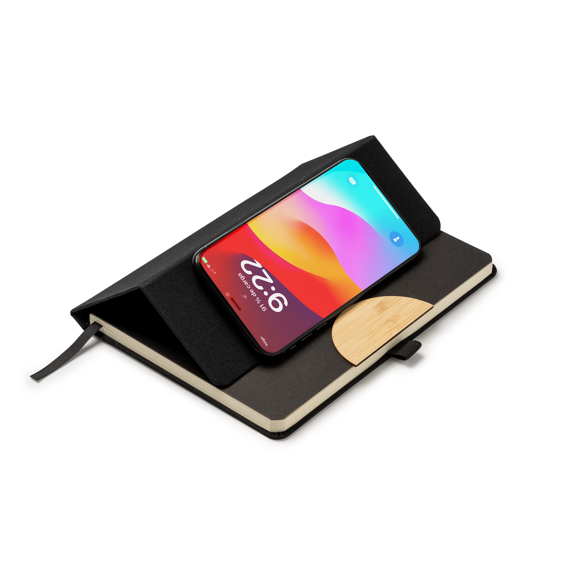 Bloc de notas A5 con tapa rígida de RPET con función soporte para dispositivos. Banda elástica de cierre, marcapáginas y soporte para bolígrafo.