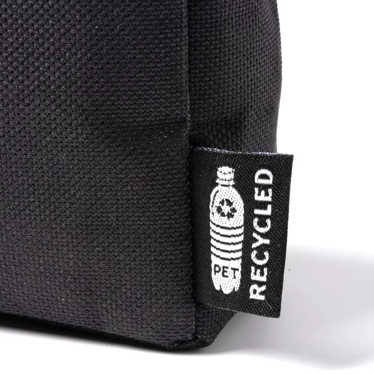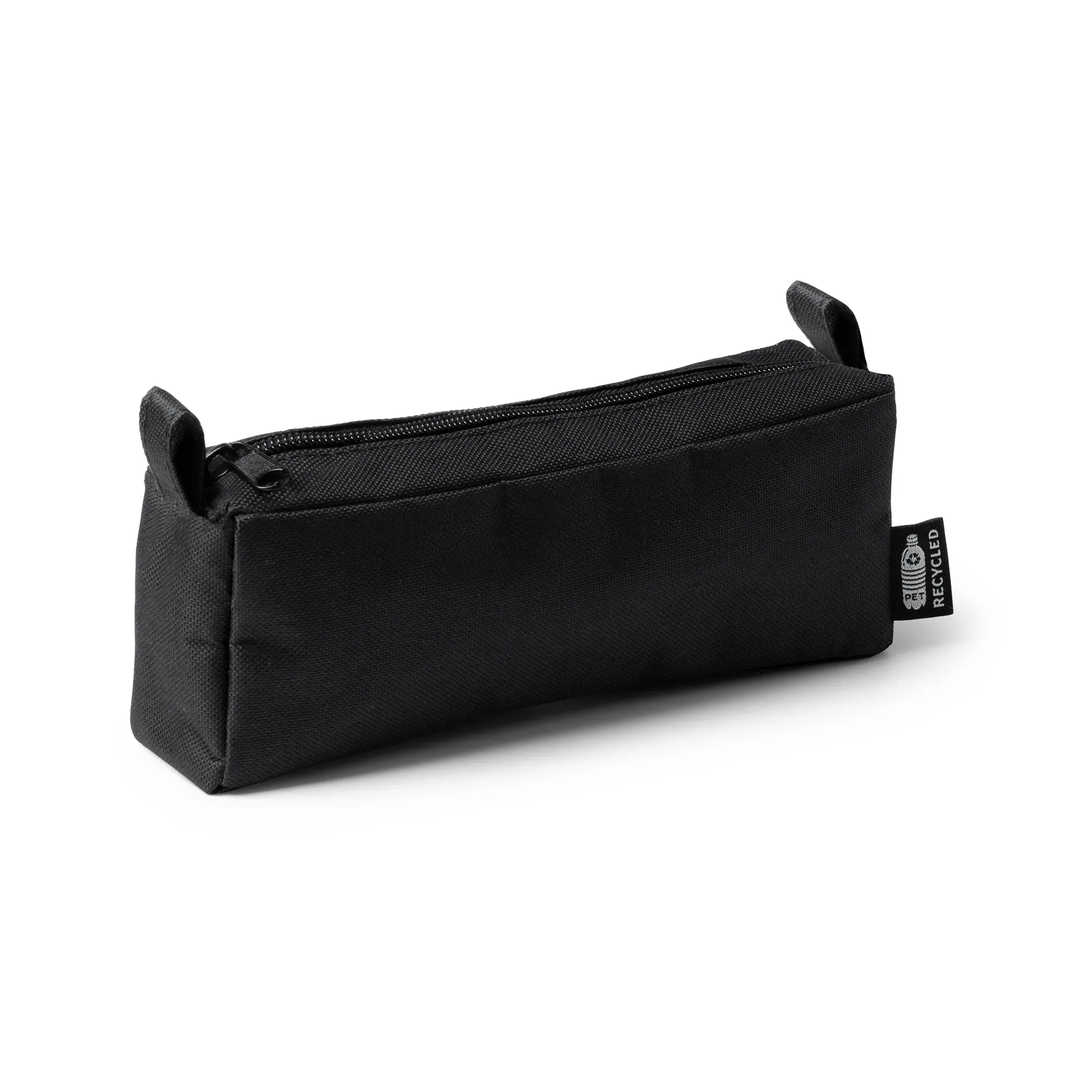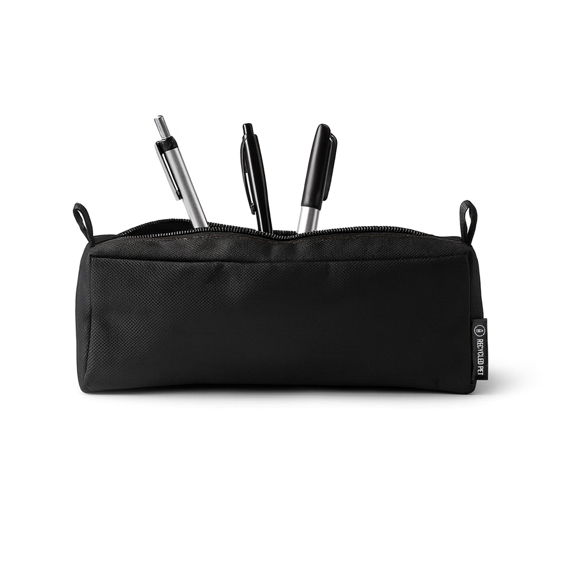 Estuche rectangular elaborado de material RPET procedente de botellas recicladas. Cuenta con cremallera a juego y cintas tiradoras en los laterales. Disponible en varios colores.