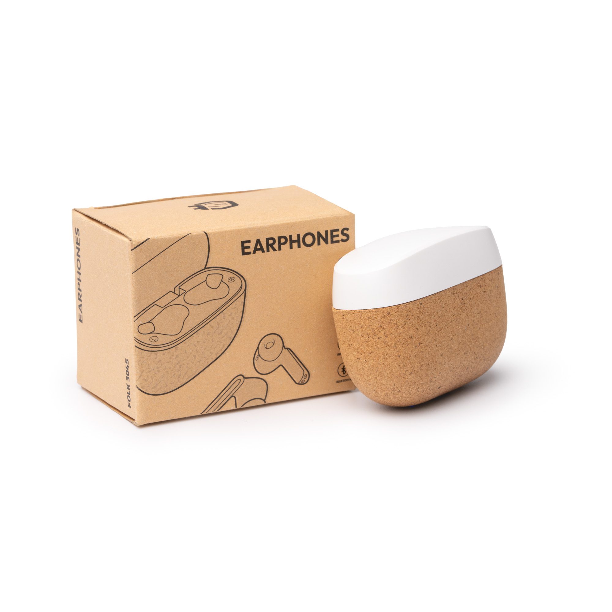 Auriculares inalámbricos con cuerpo elaborado en ABS reciclado y recubrimiento de corcho natural. Cuenta con función de manos libres con botón multifunción táctil en el lateral de los auriculares para control de llamadas y función de asistente de voz mediante control multifunción. Reproducción de audio mediante conexión Bluetooth, control de pistas y volumen mediante botón táctil lateral del auricular.
