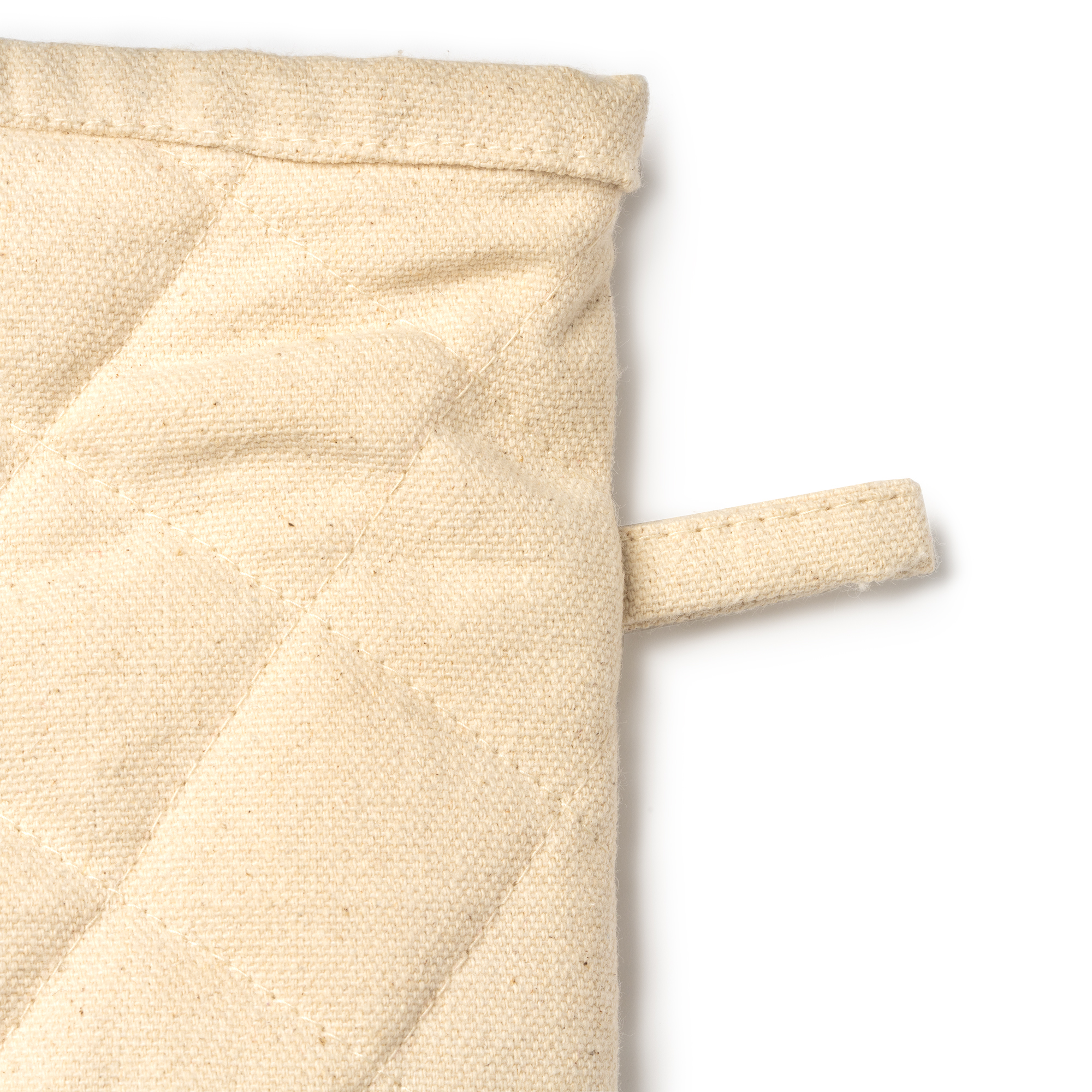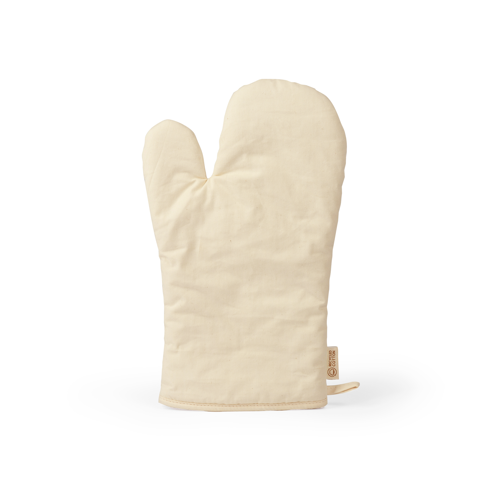 Manopla 100% de algodón reciclado. Una cara lisa ideal para marcaje y cinta para colgar.