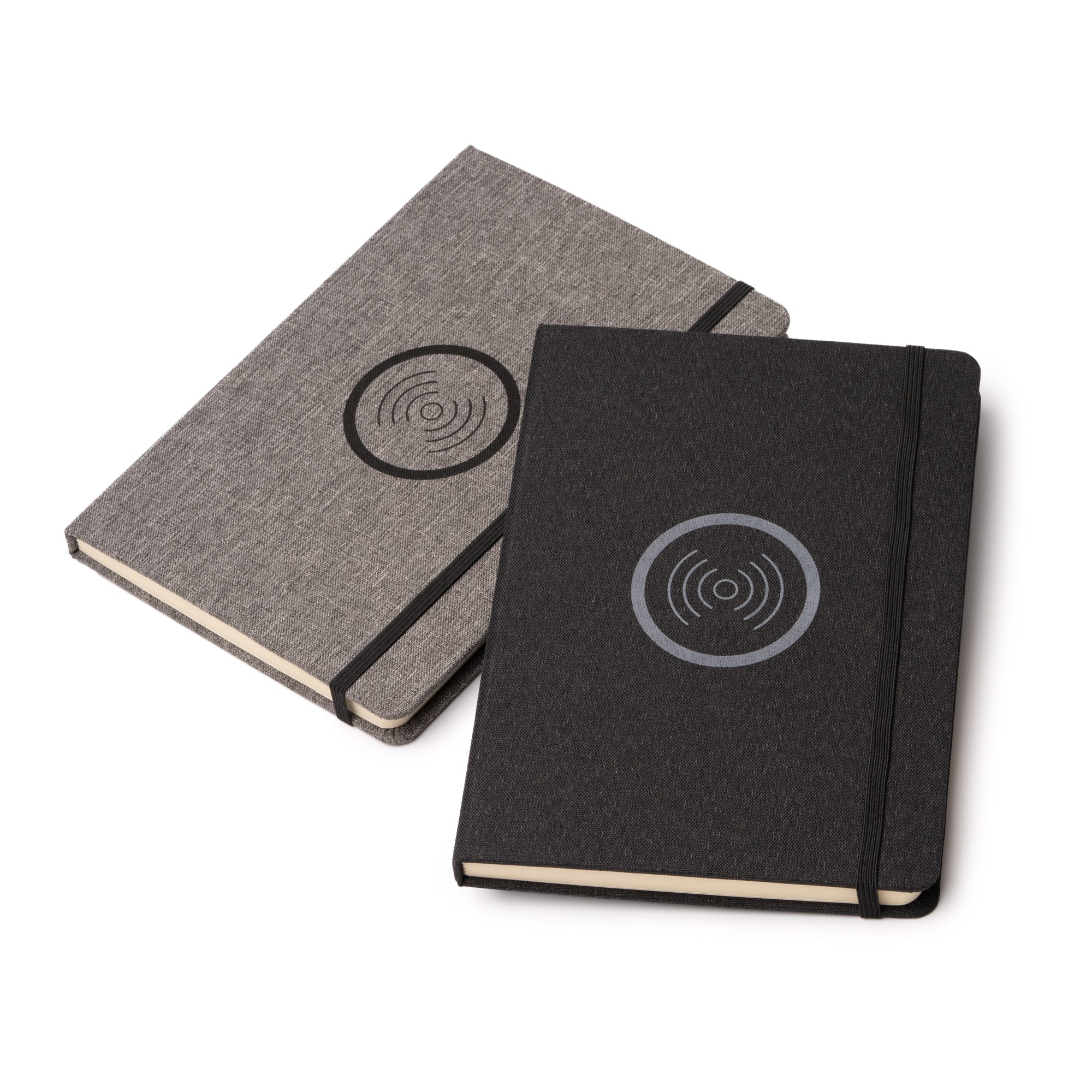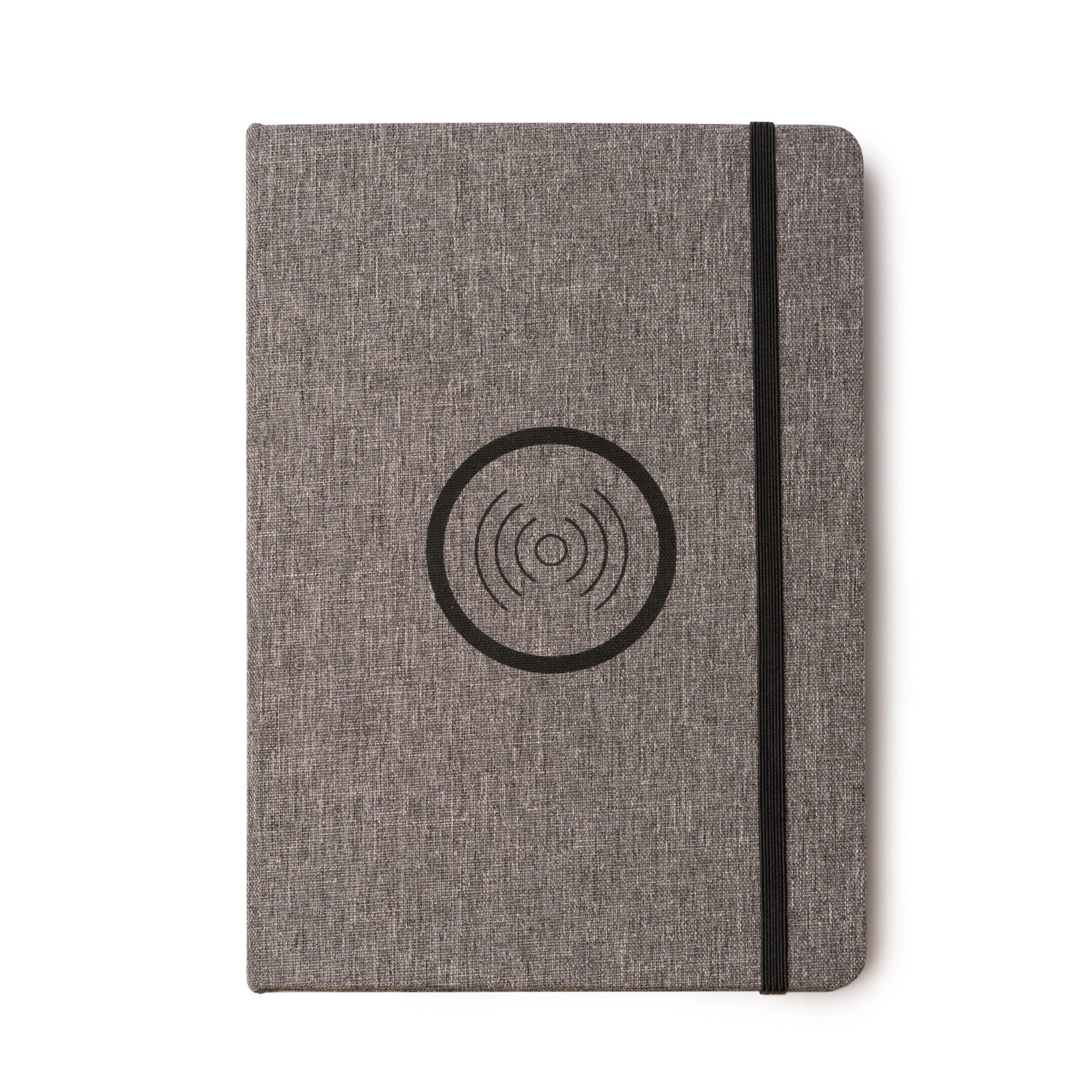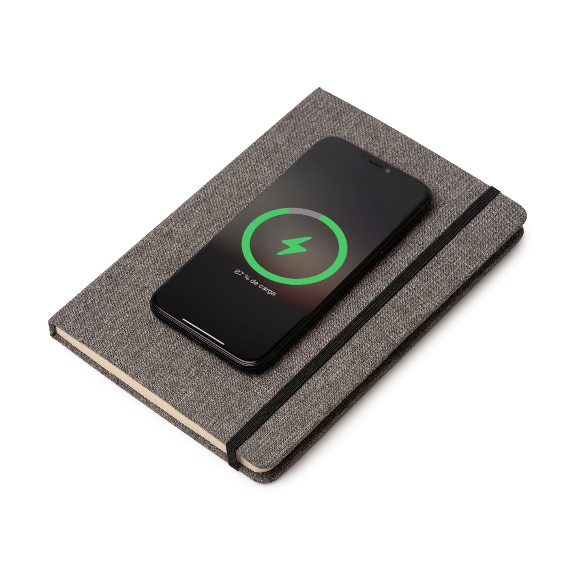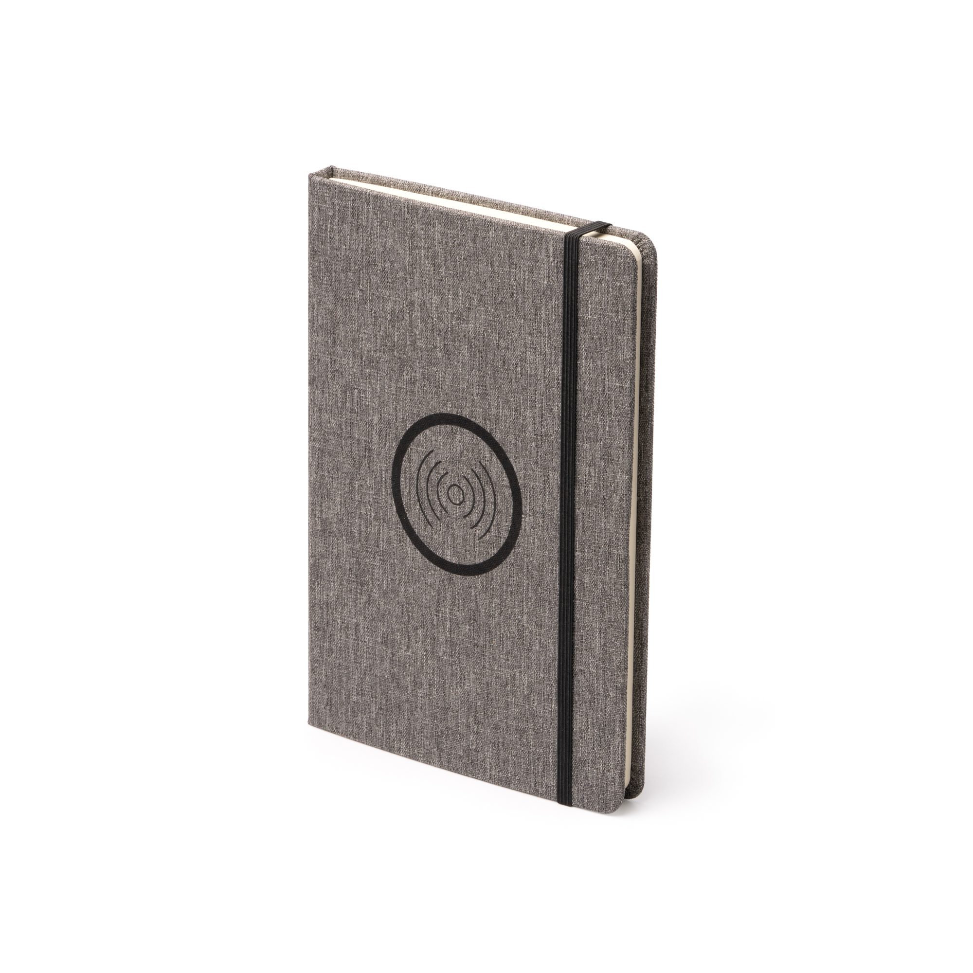 Bloc de notas tamaño A5 elaborado en tejido RPET con superficie de carga inalámbrica de 15W para dispositivos móviles. Cuenta con puerto tipo C para conexión de carga y cierre elástico del bloc.