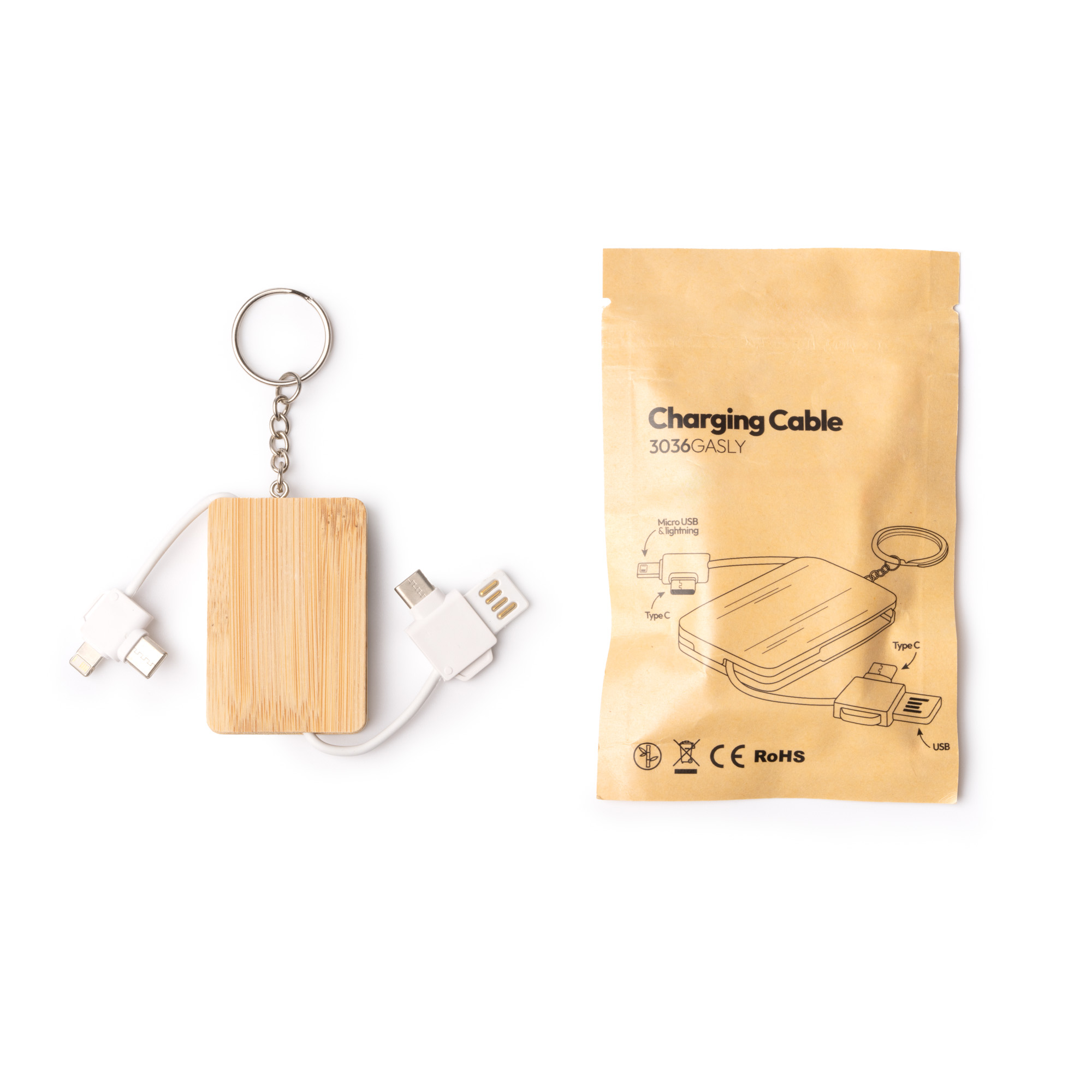 Cable cargador 4 en 1, con cuerpo realizado en bambú. Cuenta con cable Tipo C de entrada y salida y conectores USB y Lightning. Los cables son encajables en las ranuras laterales del cuerpo para mayor comodidad. Con anilla de llavero insertada.