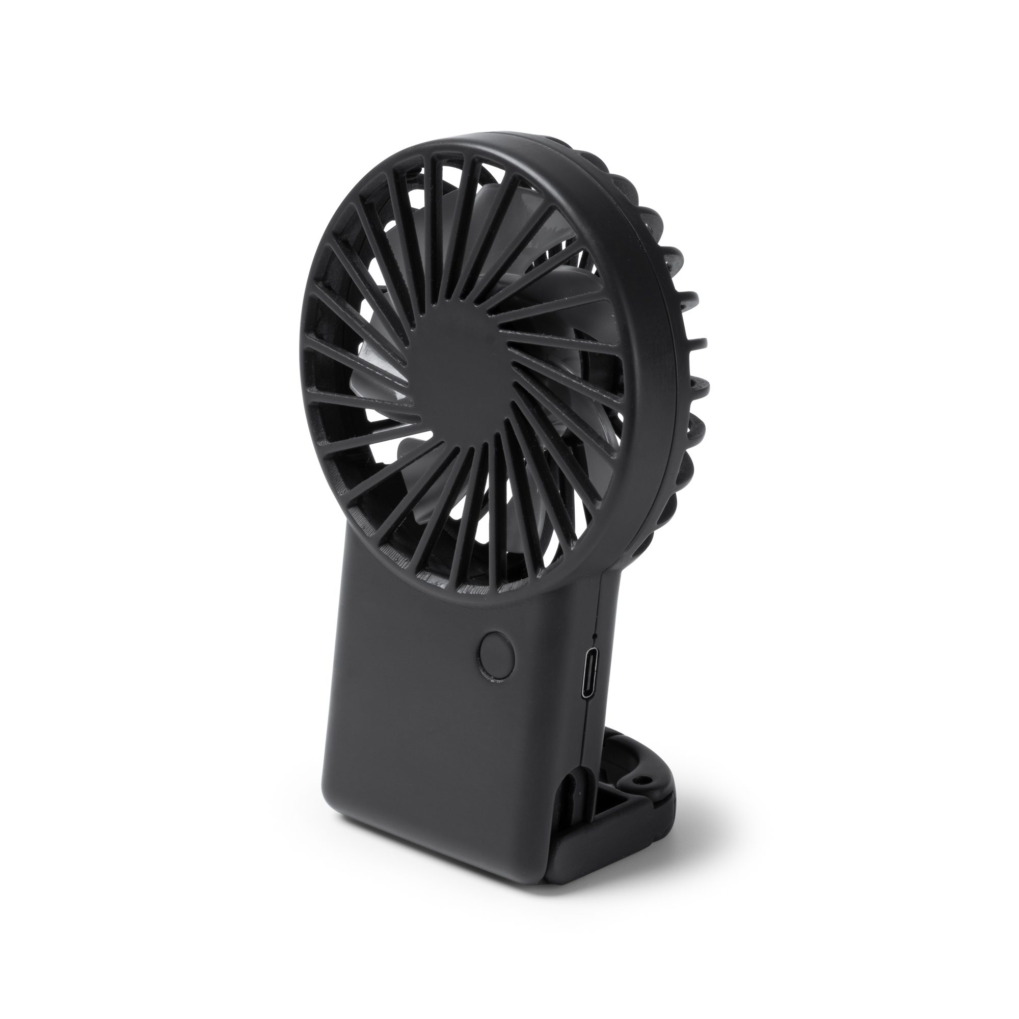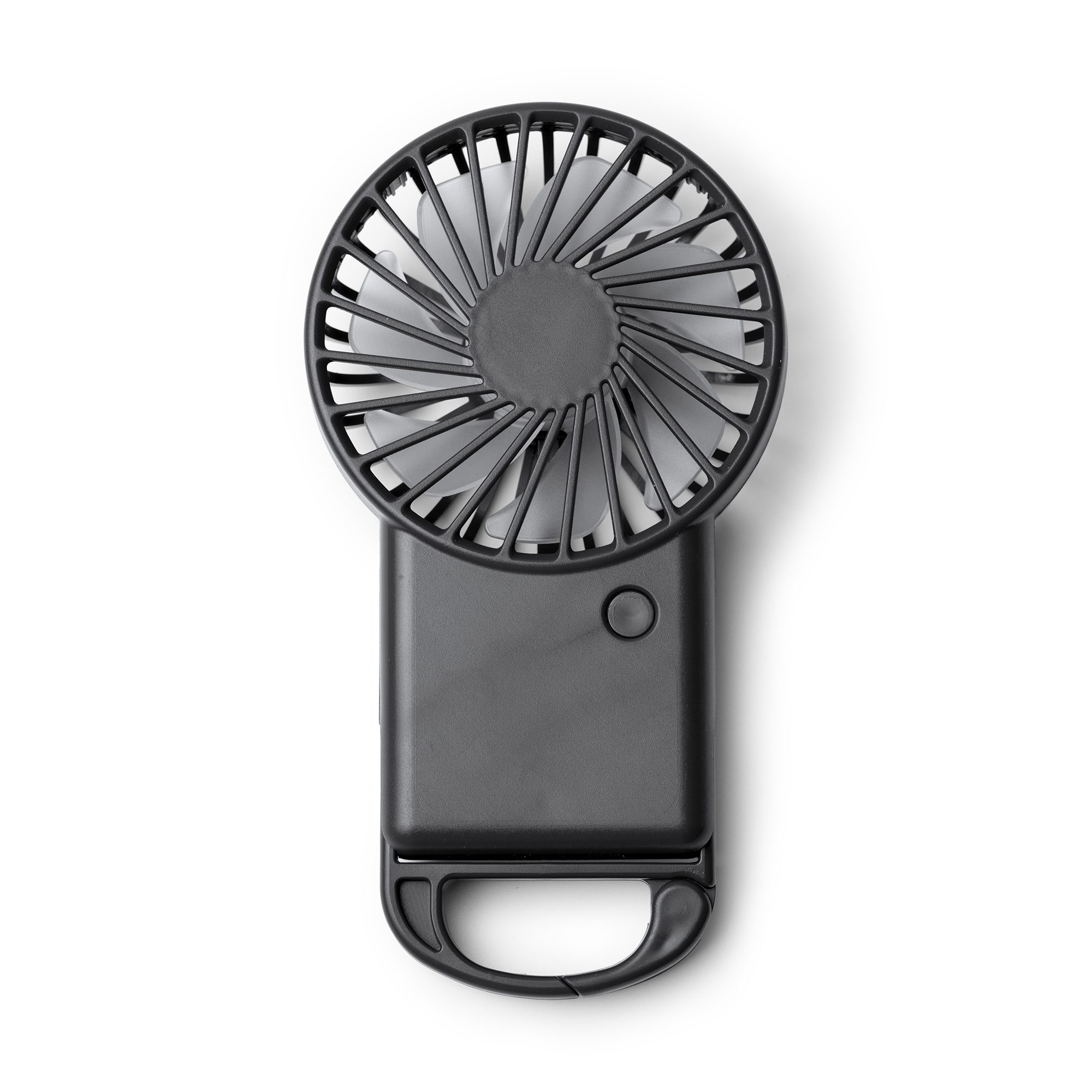 Ventilador de mano elaborado en ABS reciclado, con mosquetón y función soporte. Con tres modos de velocidad, seleccionables mediante botón multifunción, y batería recargable mediante cable Tipo C, incluido.