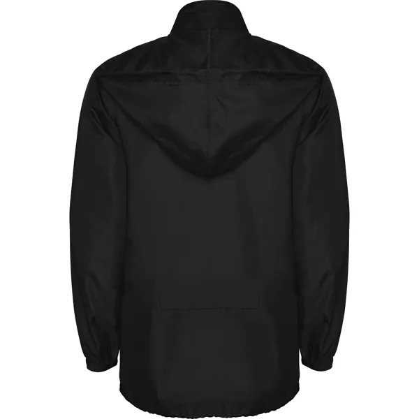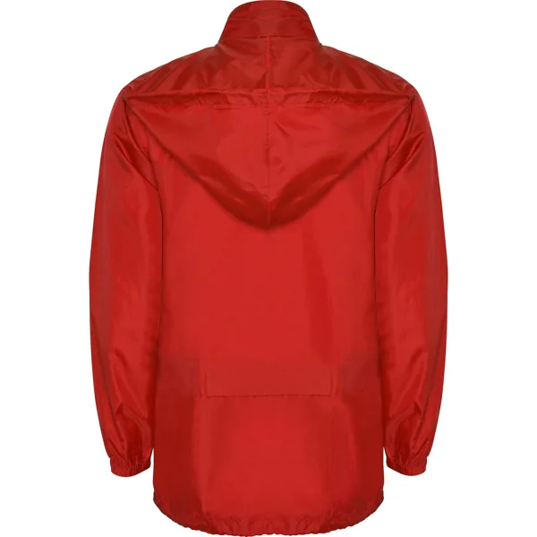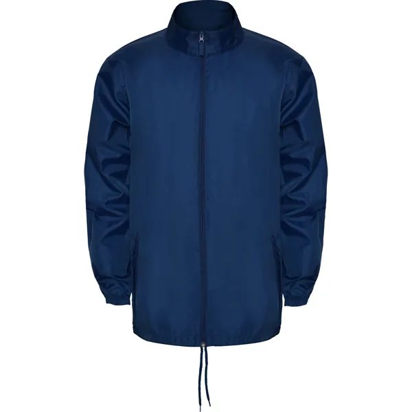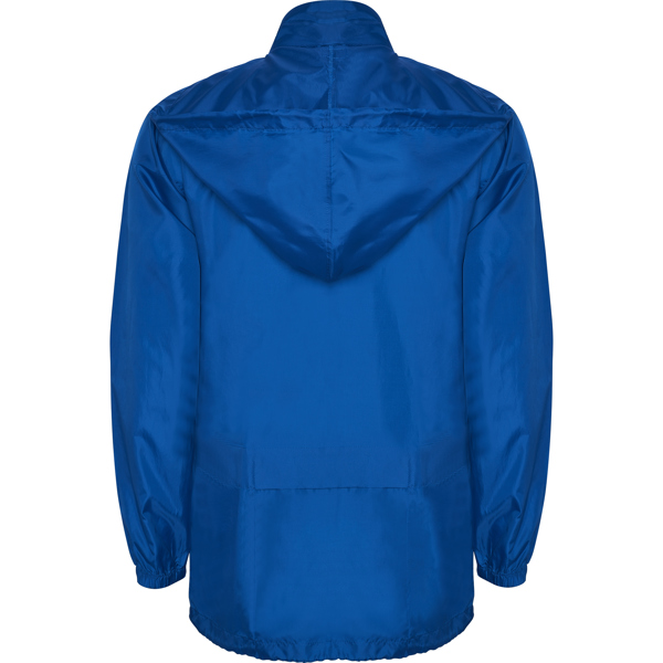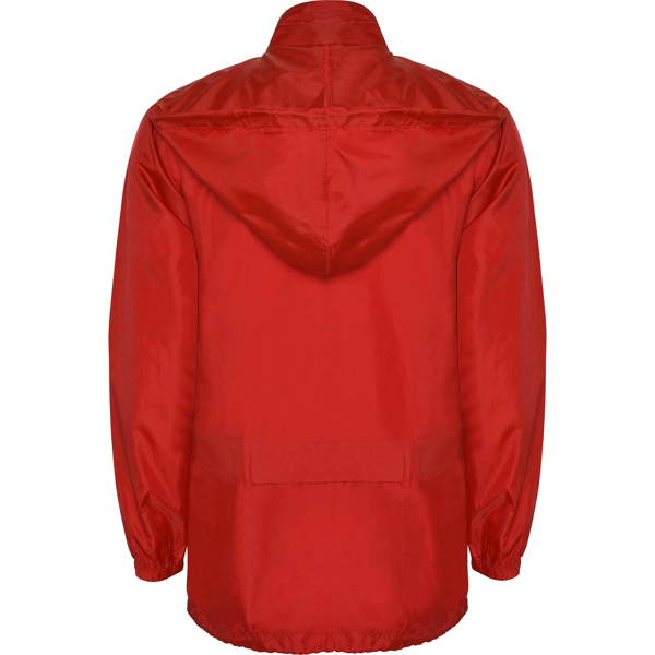 Chubasquero con cuello alto y capucha extraíble con cordón ajustable. Repelente al agua. Resistente al viento. Cremallera frontal al tono. Bolsillos laterales con cremallera cubiertos por solapa del mismo tejido. Puños elásticos. Bajo con cordón interno ajustable. Goma en bolsillo para su plegado.