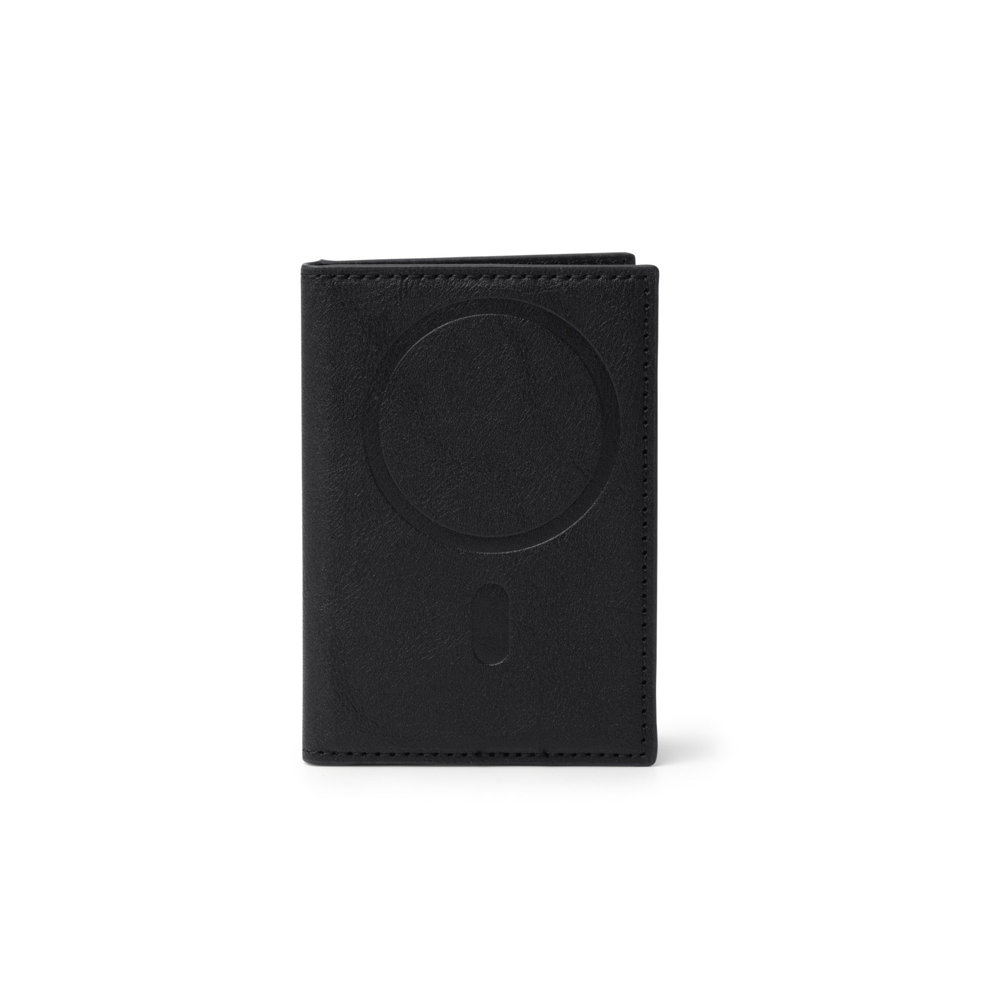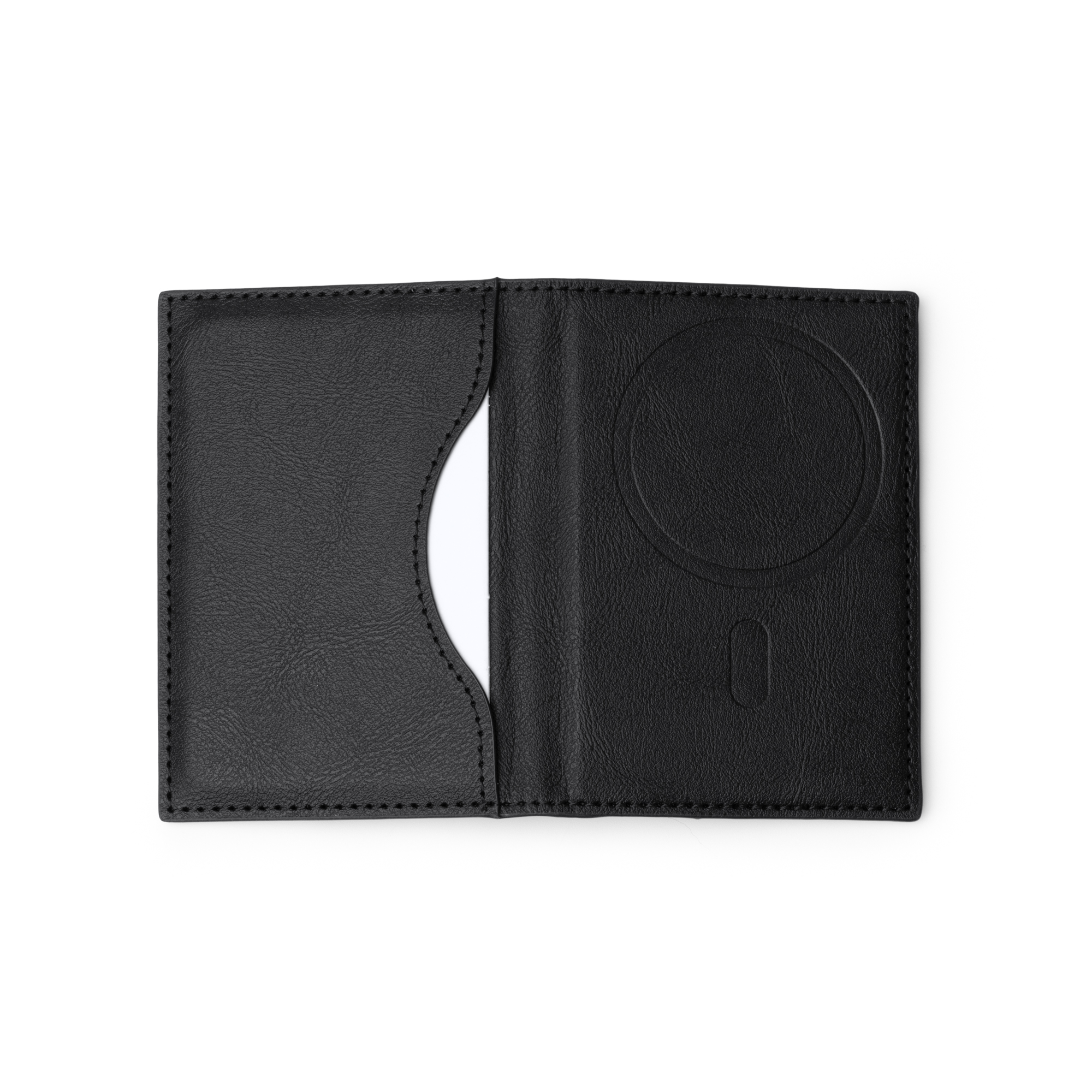 Tarjetero magnético plegable elaborado en PU reciclado. Accesorio ideal para llevar tus tarjetas junto a tu teléfono gracias a su sistema magnético. Con tres compartimentos interiores y uno exterior para distintas tarjetas.