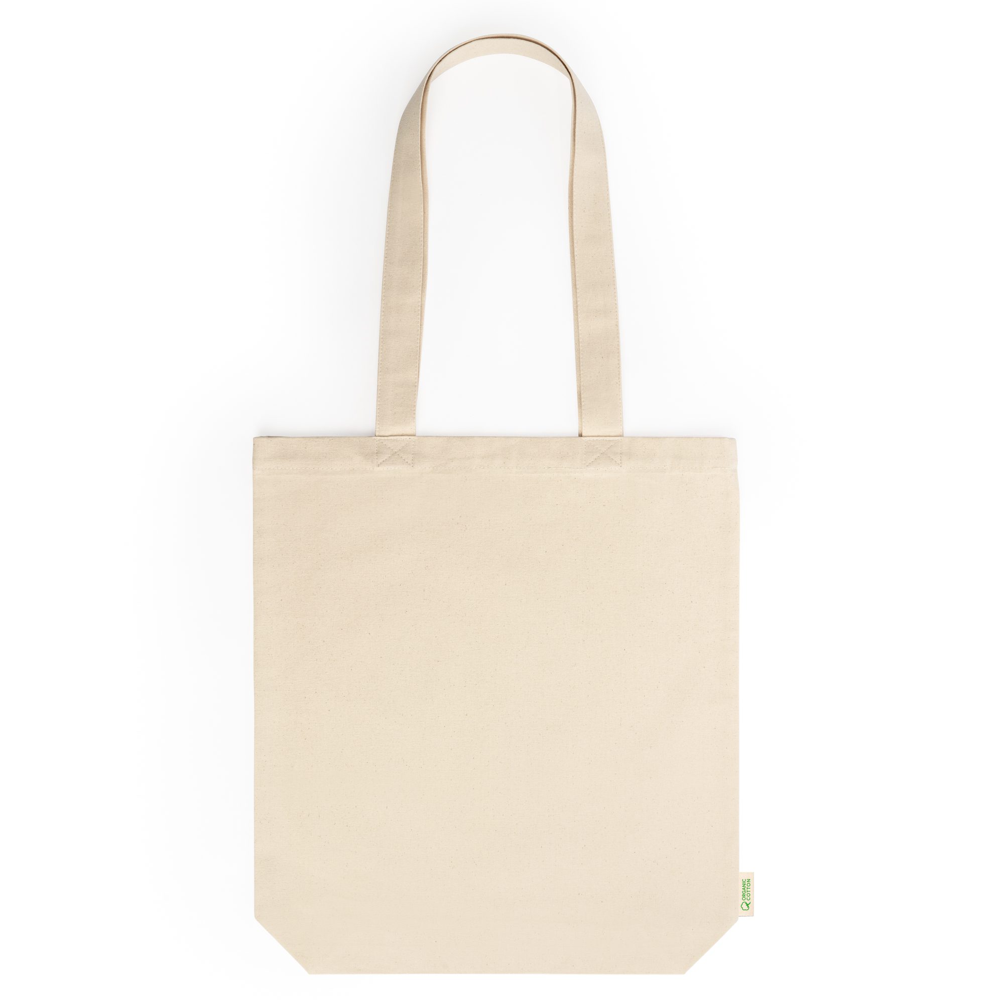 Bolsa 100% algodón orgánico de 280 g/m² con fuelle para mayor adaptabilidad y versatilidad. Incorpora prácticas asas largas de 70cm para convertirla en una opción cómoda en sus transporte.