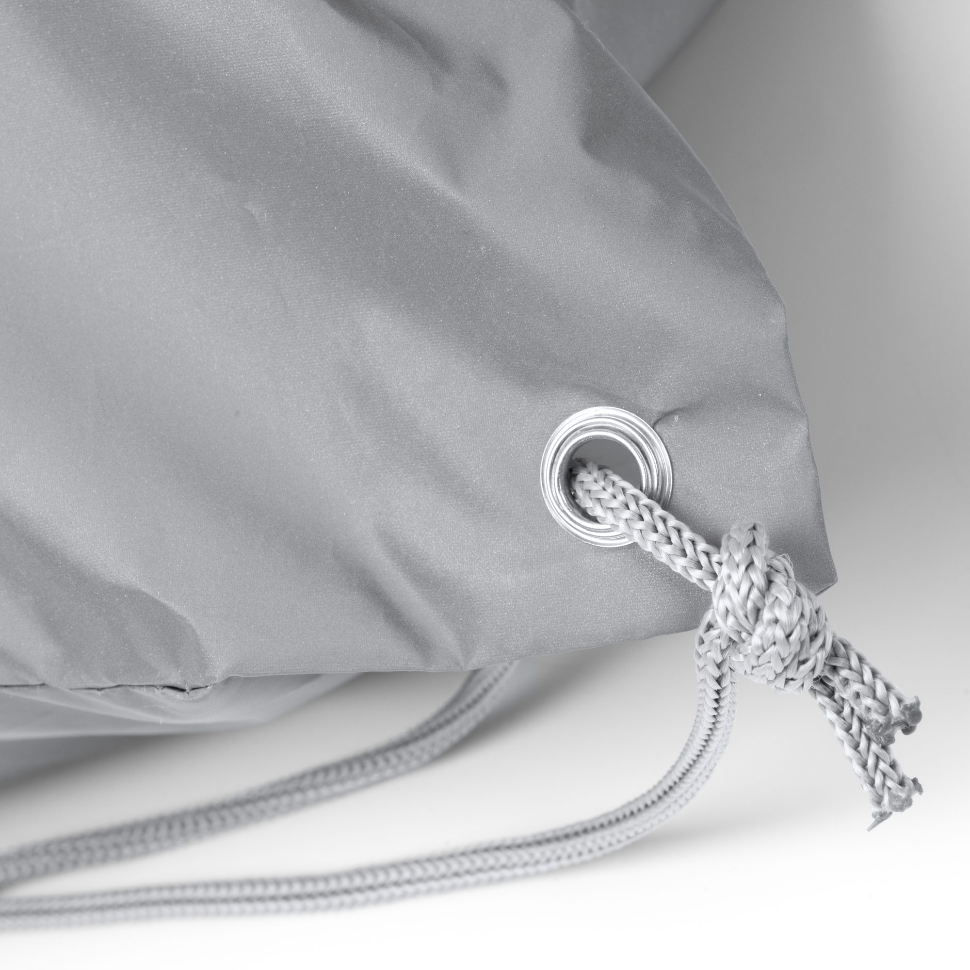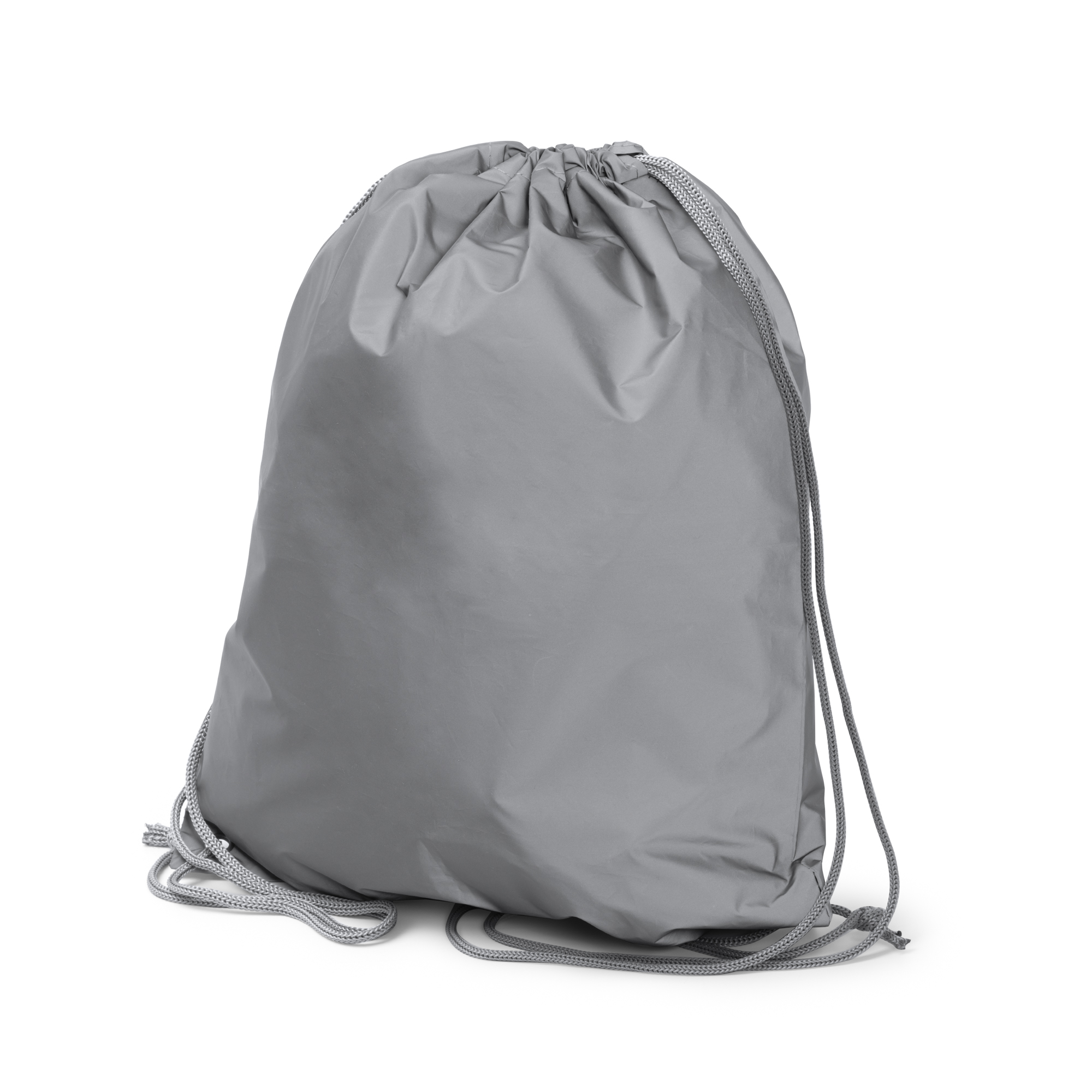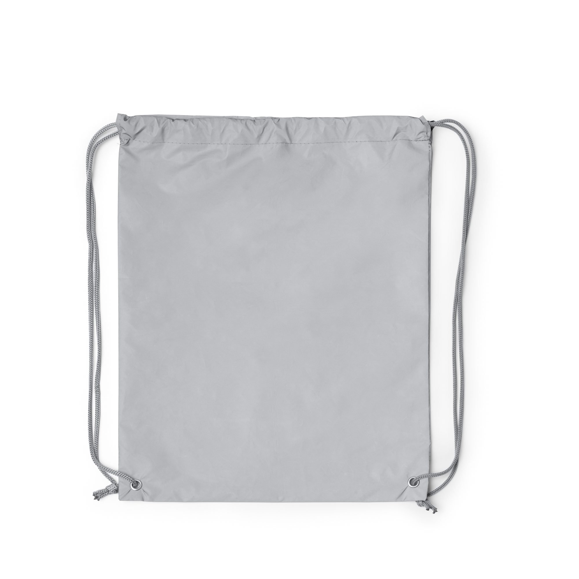 Mochila de cuerdas reflectante realizada en suave poliéster 210D. Resistente hasta 7kg y material repelente al agua. Con ojales reforzados en metal.