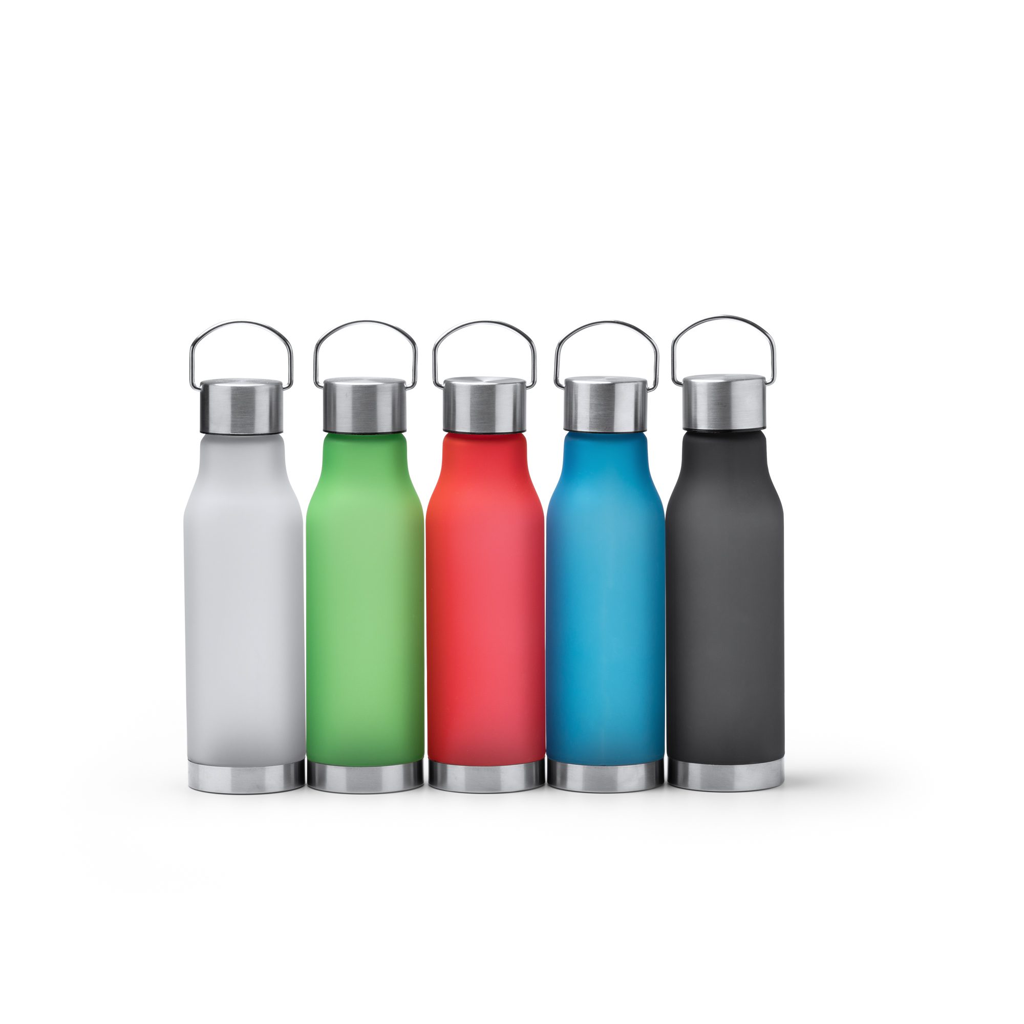 Bidón de RPET de acabado translúcido efecto hielo con tapa, asa y base de acero inoxidable. Capacidad 600 ml.