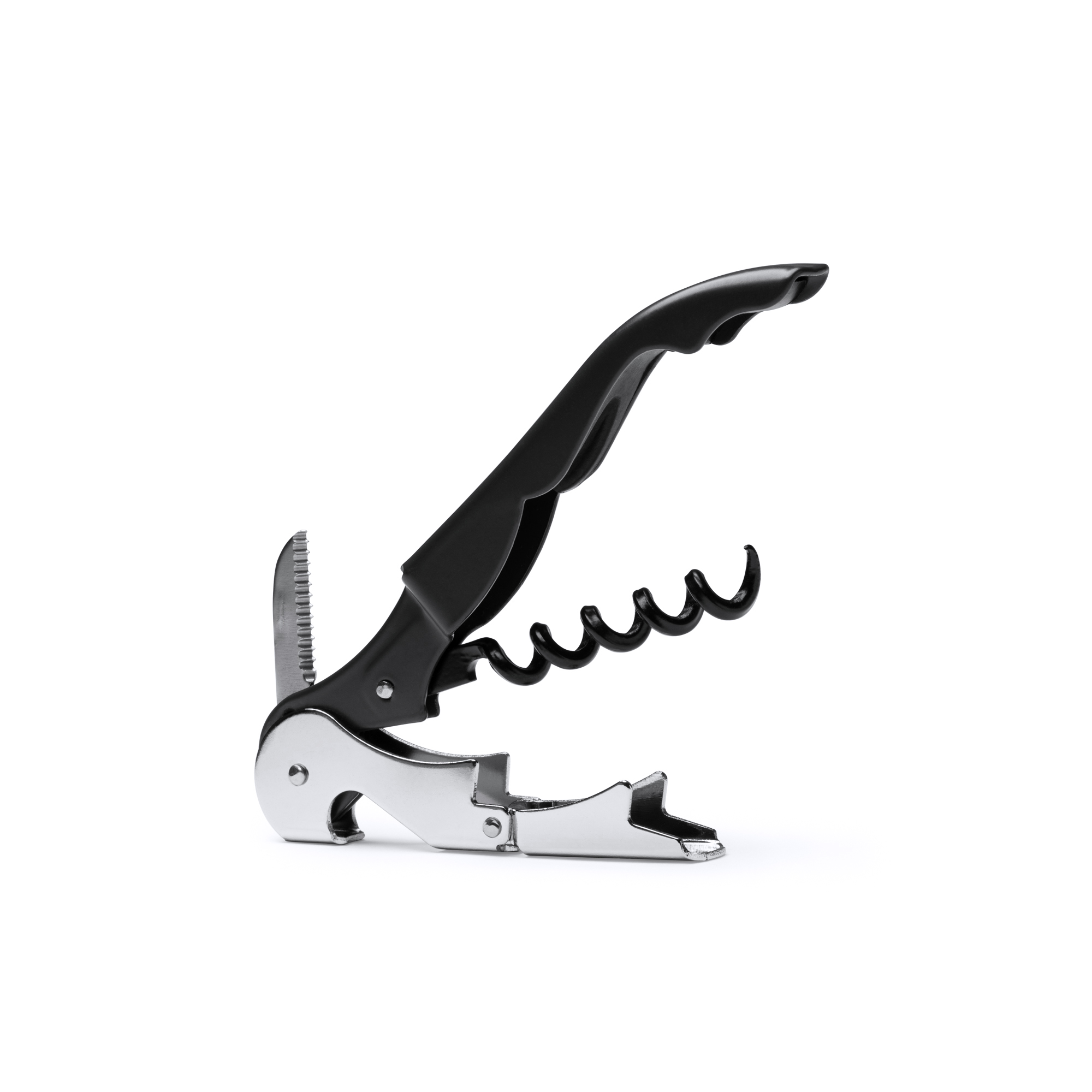Sacacorchos de estilo clásico en acero inoxidable con dos posiciones. Cuenta con un accesorio en el extremo con función de corte en sierra. Una multiherramienta doblemente funcional.