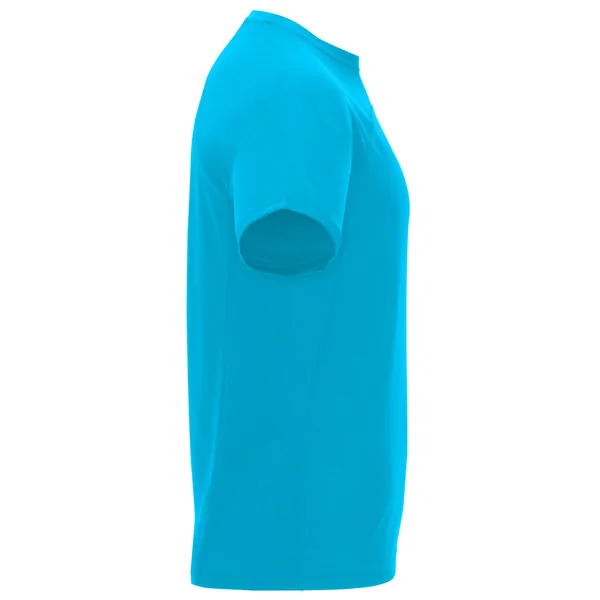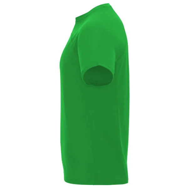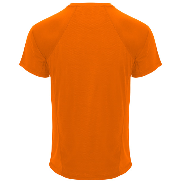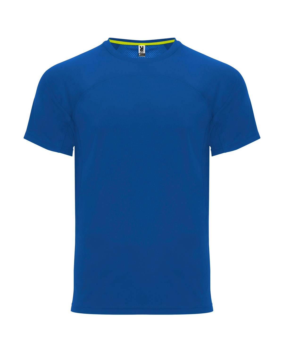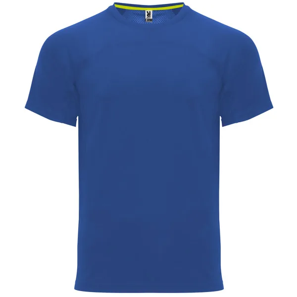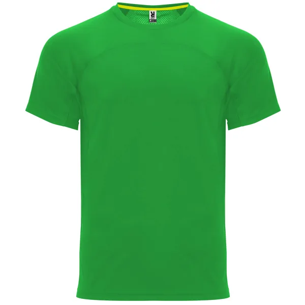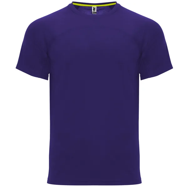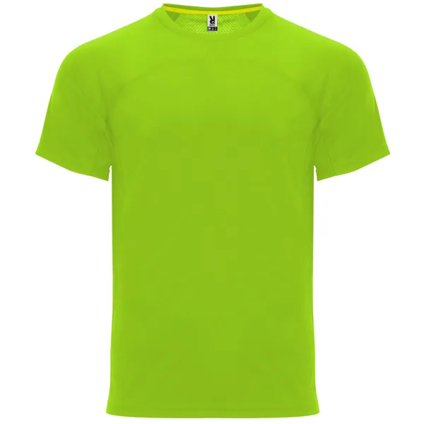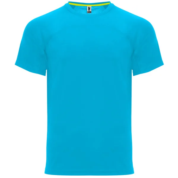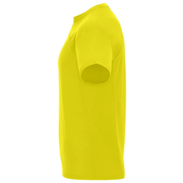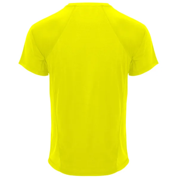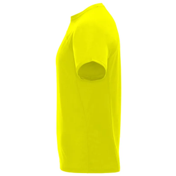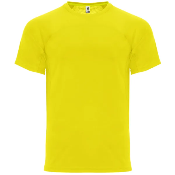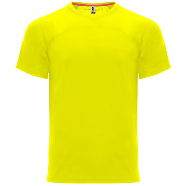 Camiseta técnica manga ranglán unisex transpirable. Combinación de tejidos. Cuello redondo del mismo tejido al tono. Cubrecosturas mismo tejido en amarillo fluor.