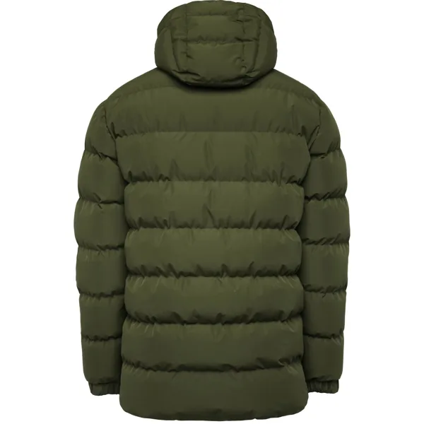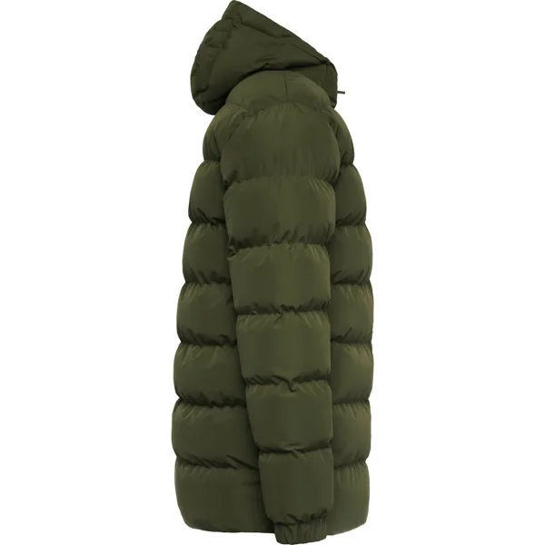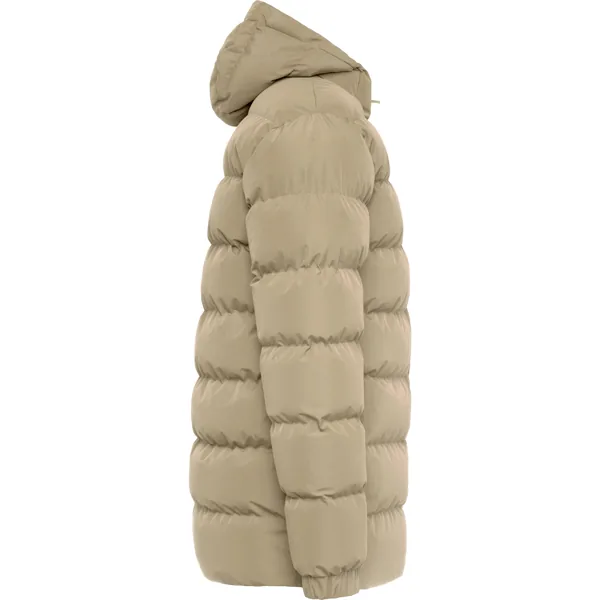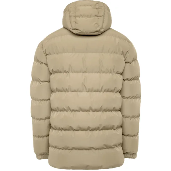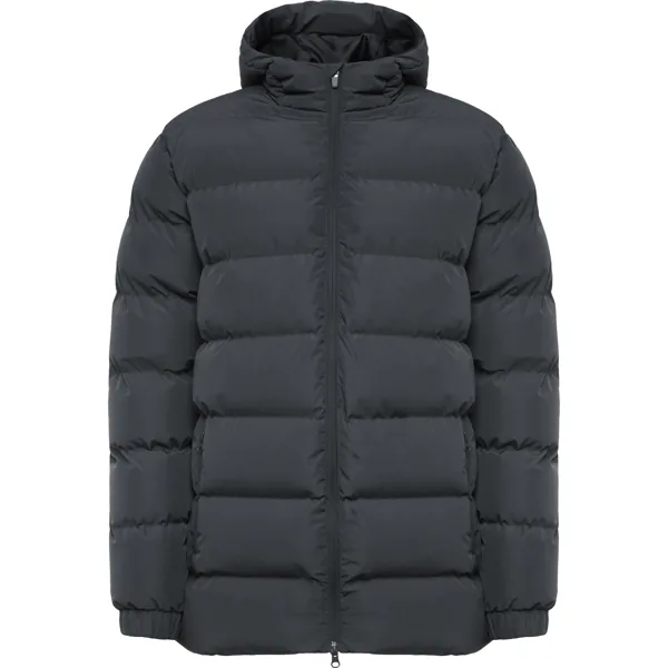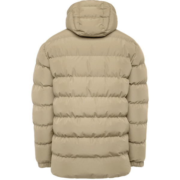 Parka acolchada repelente al agua con capucha fija y visera. Cremallera frontal al tono y tirador de doble dirección. Protector de barbilla del mismo tejido. Puños elásticos. Bolsillos laterales con cremalleras al tono. Bolsillo interior en pecho izquierdo. Acceso interior para reprocesos.