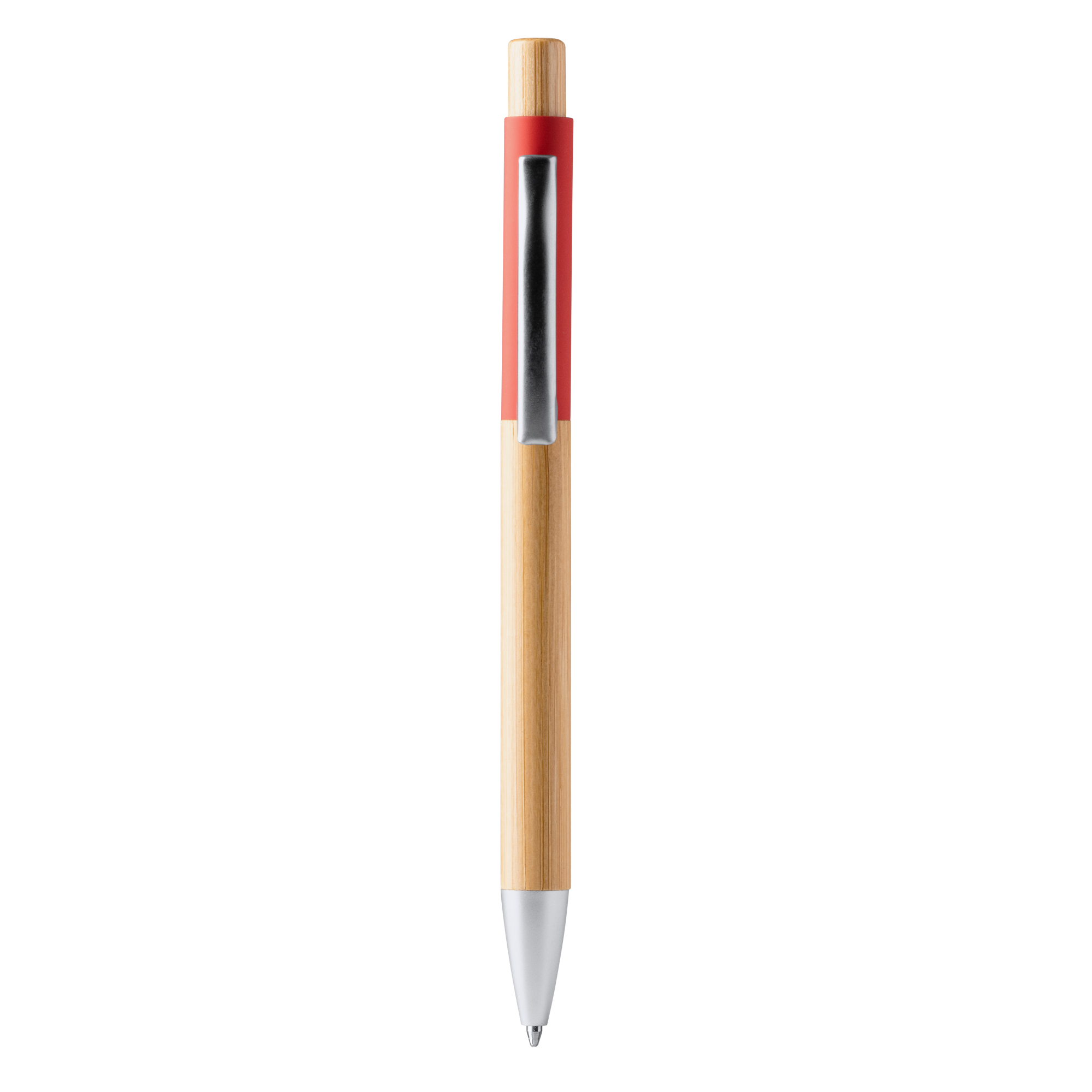 Bolígrafo con cuerpo y pulsador de bambú. Detalle en color de tacto suave.
