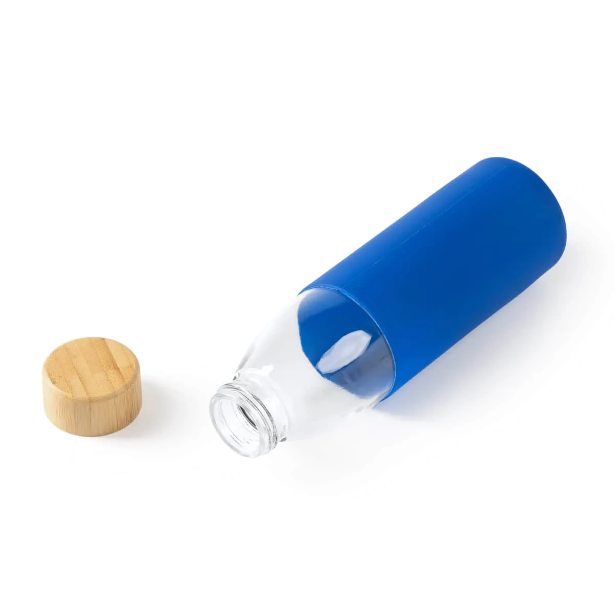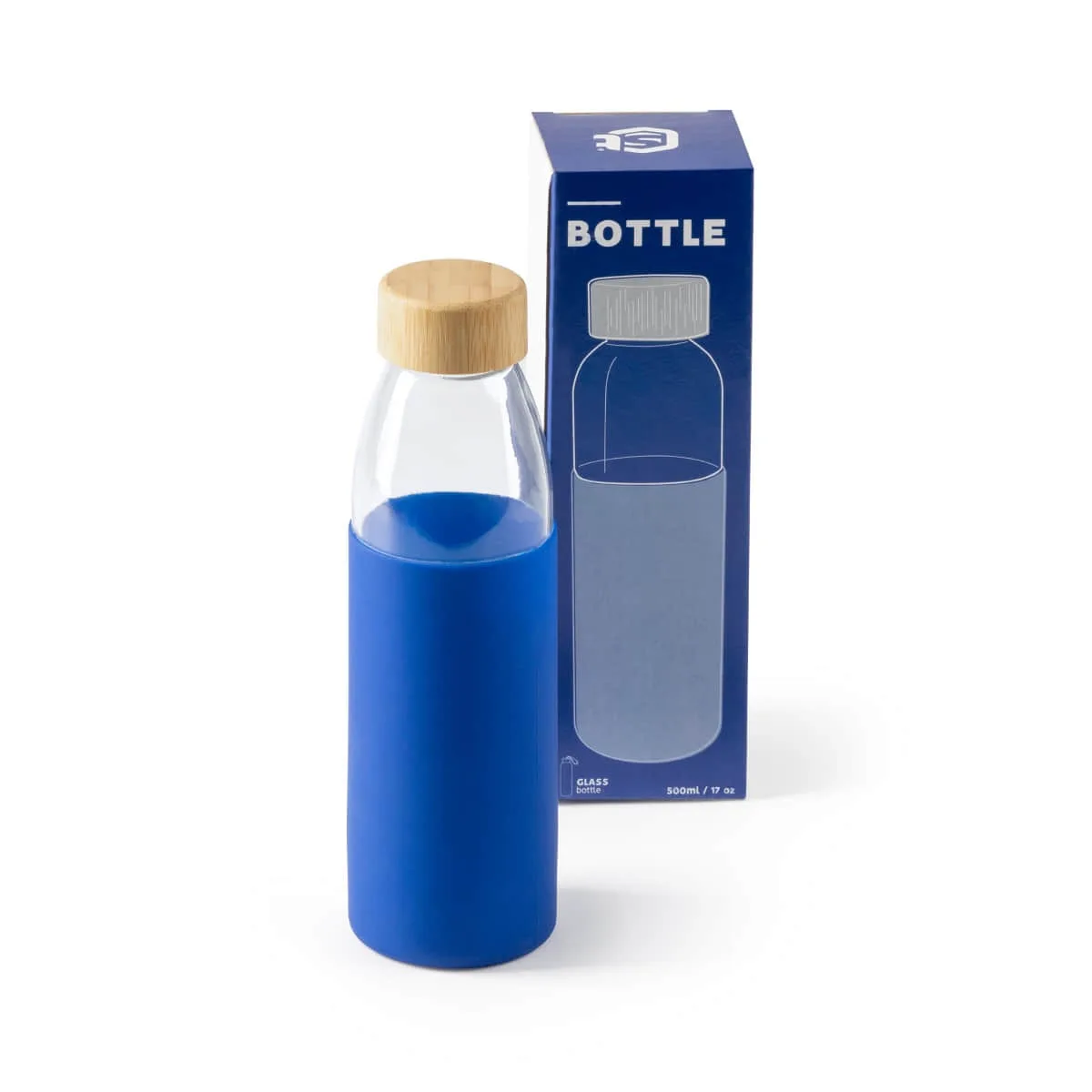 Bidón de cristal con tapón de bambú y funda de silicona en color. Capacidad 500 ml. Presentación en caja diseño.