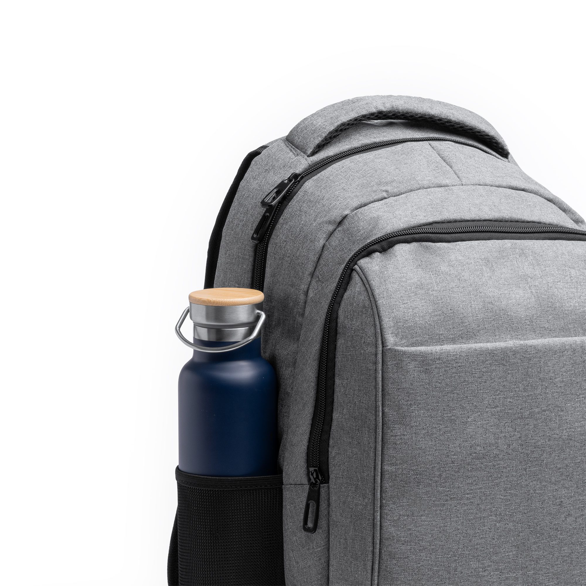 Mochila ejecutiva elaborada en poliéster reciclado RPET 300D con diseño vigoré, confeccionada con materiales reciclados. El cuerpo y el bolsillo interior principal están acolchados optimizados para el transporte y protección de tu portátil de 13″ o Tablet. Además, cuenta con un triple compartimento y bolsillos interiores con sujeción elástica de pequeño almacenamiento. También cuenta con asas y la espalda acolchadas para mayor confort, cinta para trolley para mayor versatilidad en el transporte y compartimentos laterales para almacenamiento de botellas.