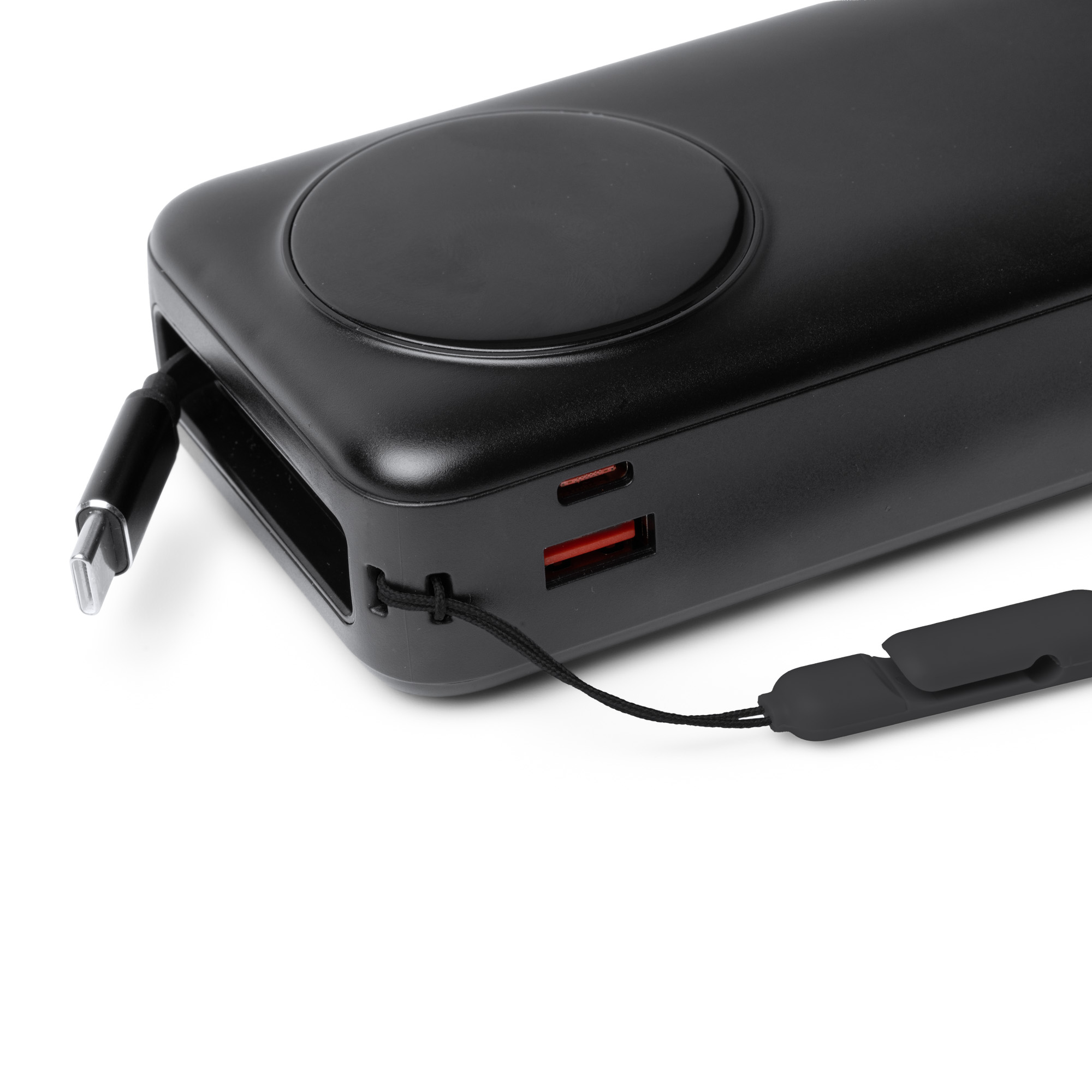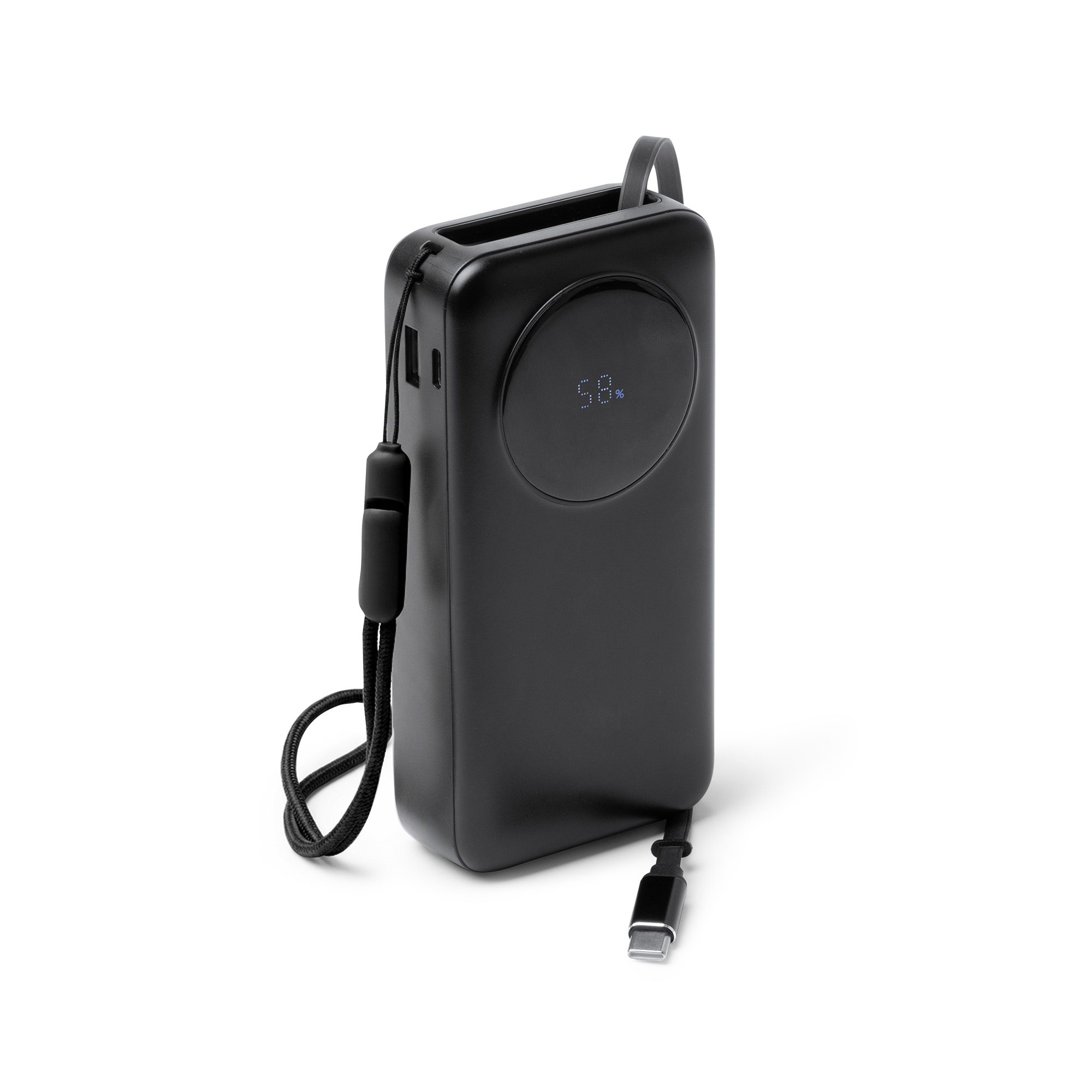 Potente batería externa 20.000mAh elaborada en ABS con salida máxima de corriente de 22,5W. Incorpora amplia pantalla LED con porcentaje de carga y un cable de salida Tipo C extensible en color a conjuto del cuerpo incorporado. Incluye un puerto de entrada y salida Tipo C y otro de salida tipo USB. Incluye cinta de transporte de tela. Esta batería se caracteriza por su gran capacidad.