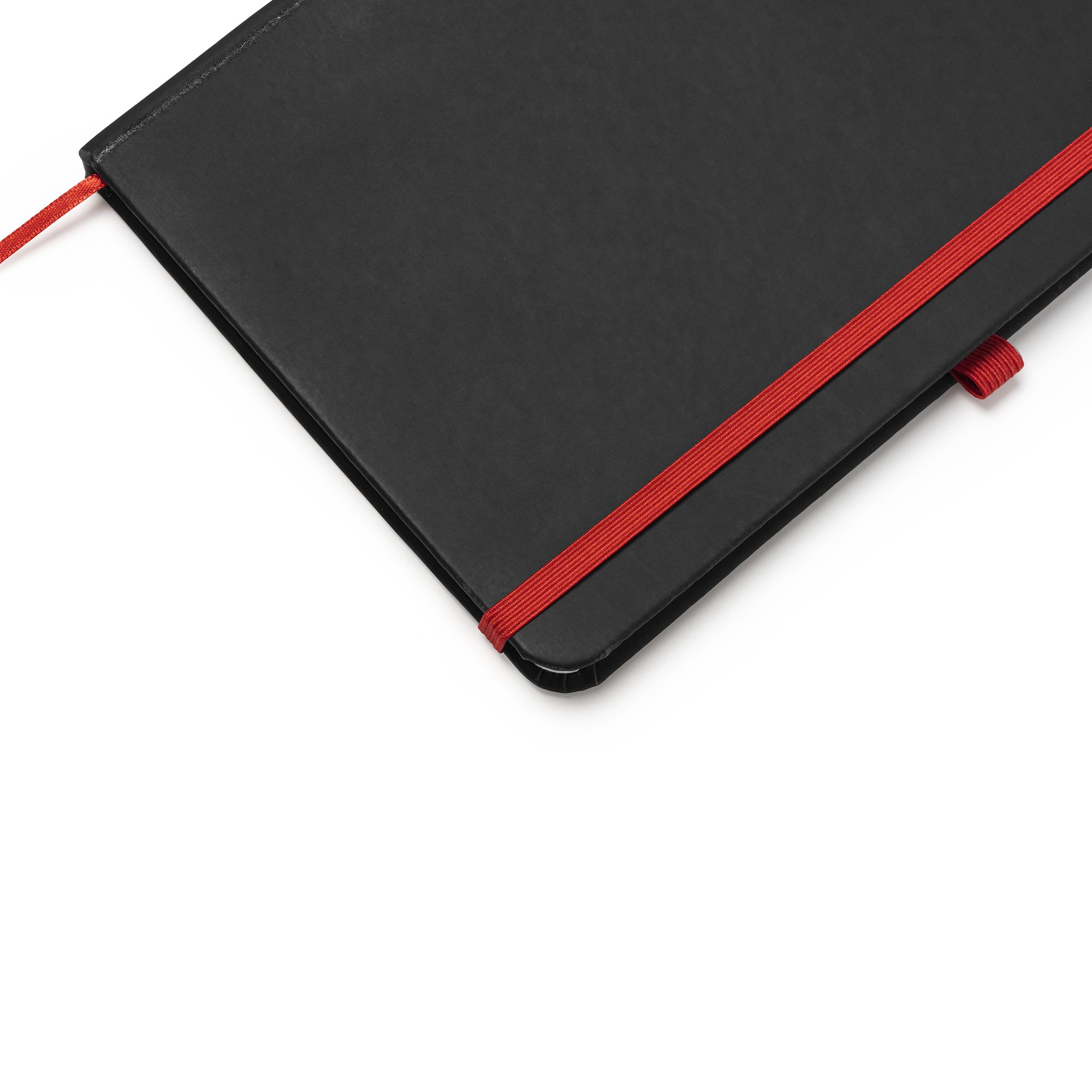 Bloc de notas A5 con tapa rígida de PU negro. Marcapáginas, banda elástica de cierre y soporte para bolígrafo a color.