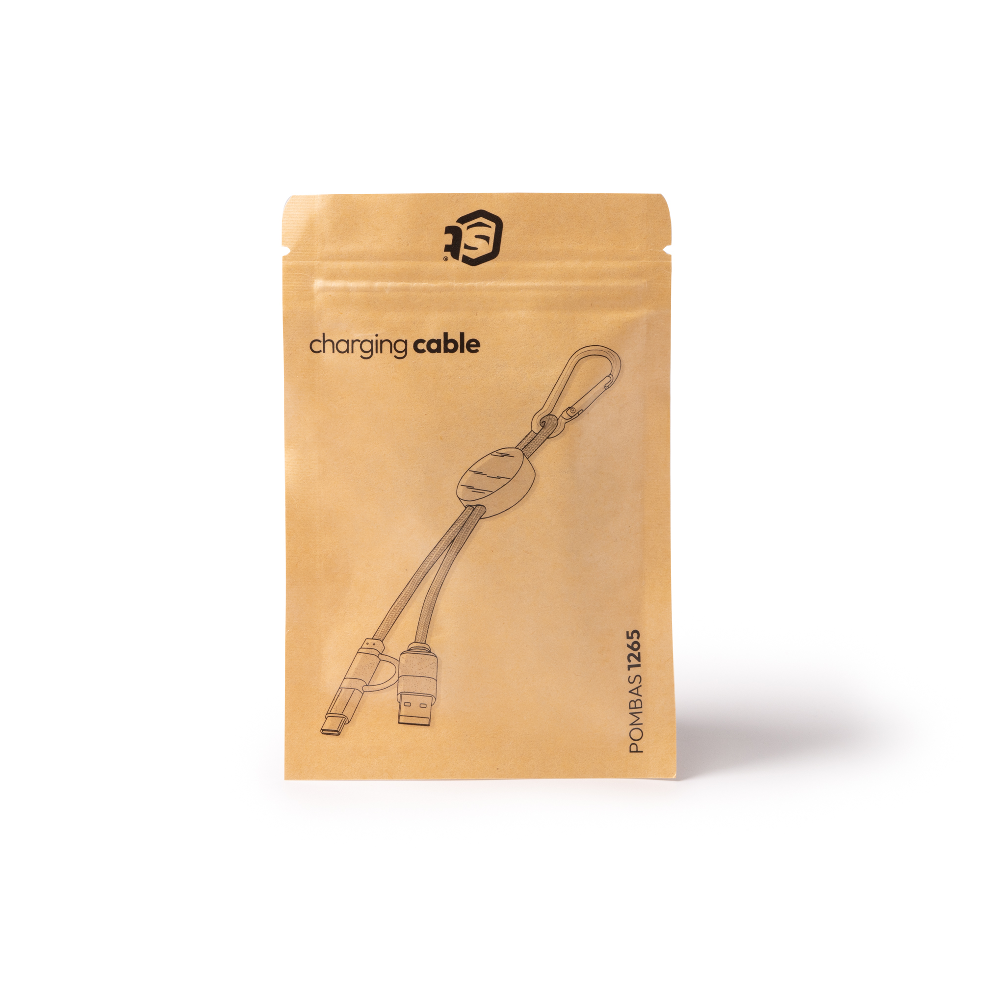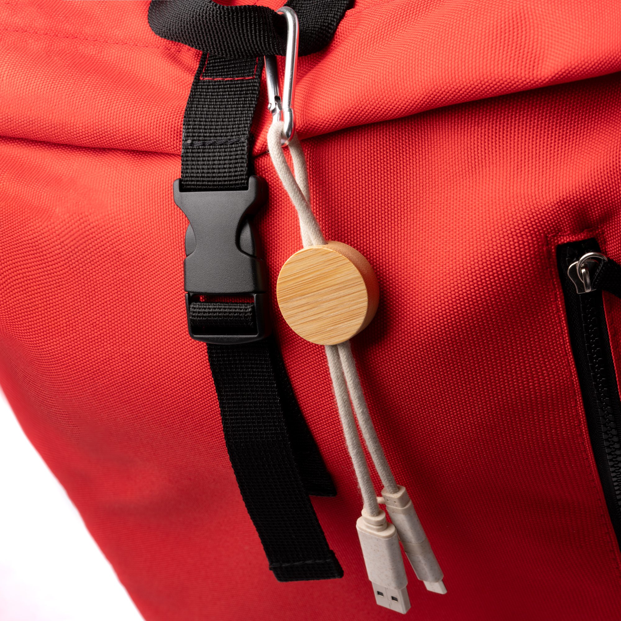 Cable 4 en 1 con cuerpo de bambú, cable en algodón y fibra de trigo. Entrada Tipo C con adaptador USB. Salida Lightning con adaptador Tipo C. Mosquetón de transporte extraíble incluido.