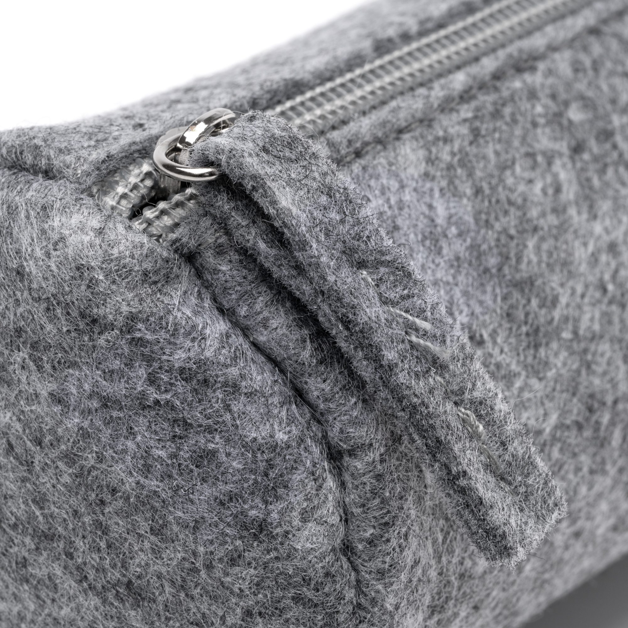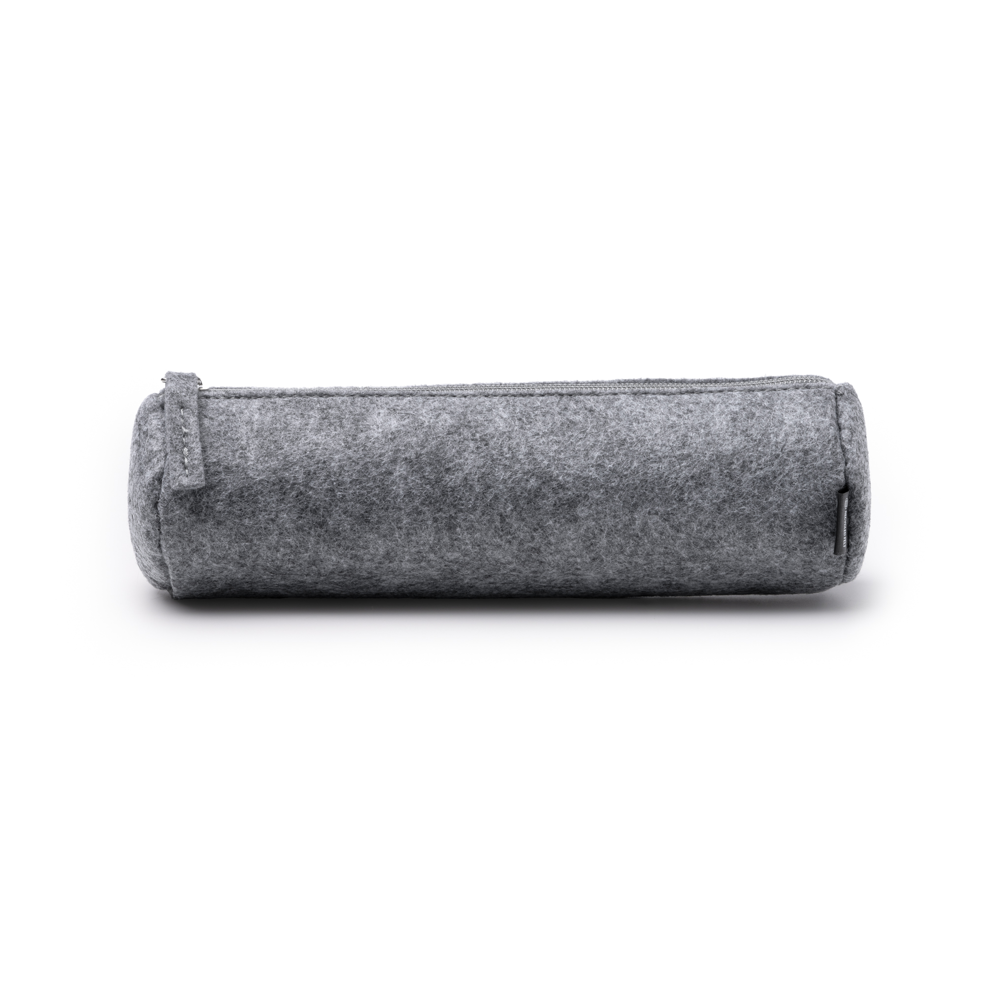 Estuche de fieltro reciclado de diseño cilíndrico con cierre de cremallera y tirador a juego.
