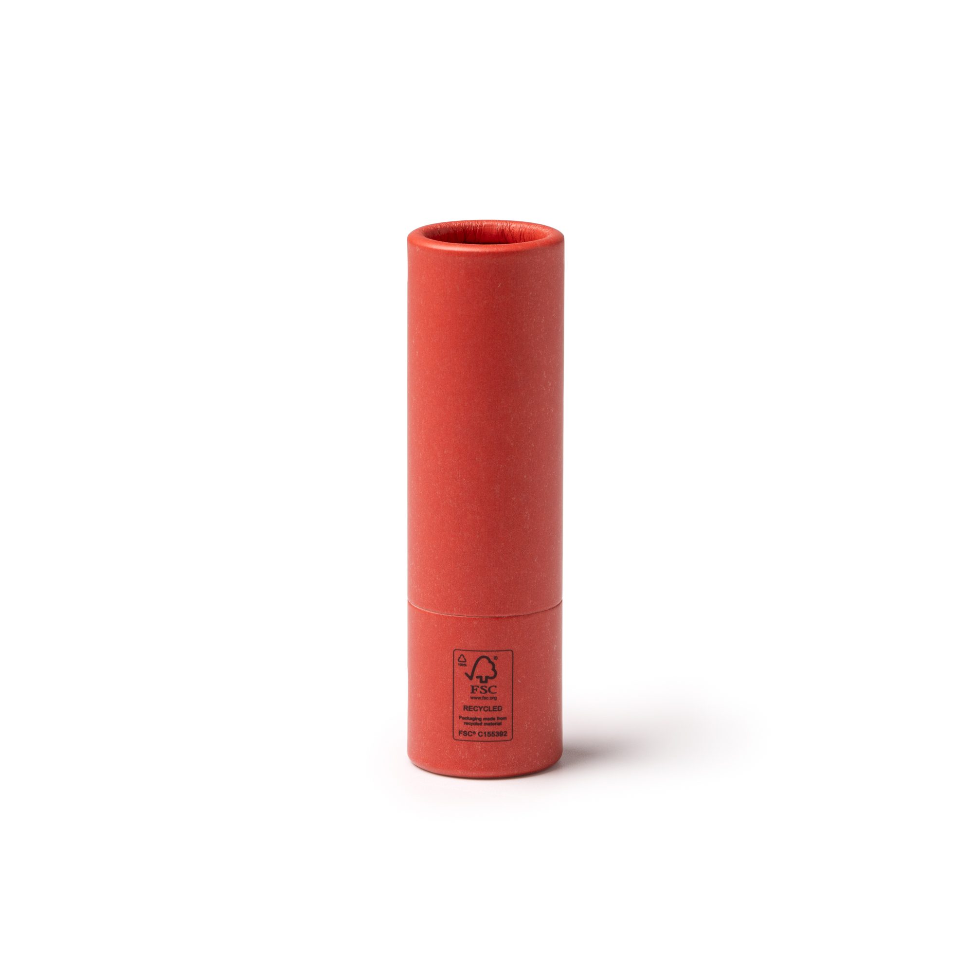 Bálsamo labial en estuche con forma de barra realizado de cartón reciclado. Con certificado FSC.