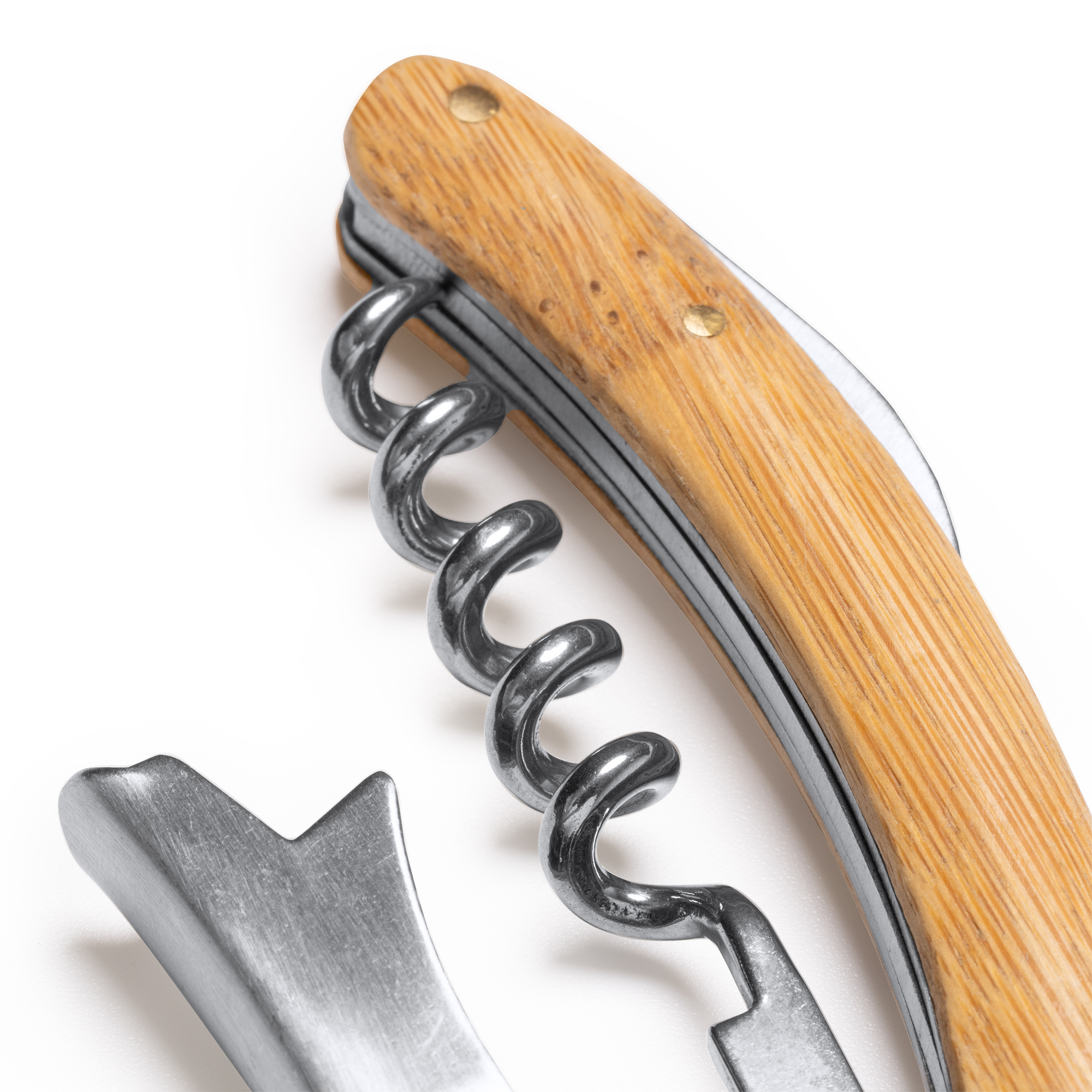 Sacacorchos de acero inoxidable estilo clásico con mango en bambú, elegante y funcional. Ofreciendo durabilidad y resistencia, con un agarre cómodo y seguro.