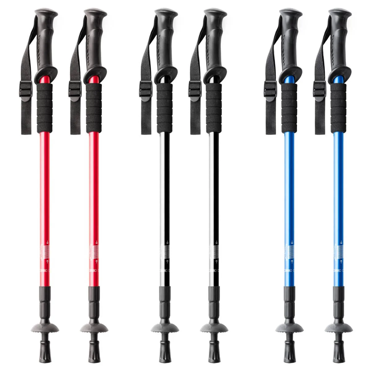 Set de bastones de trekking plegables en aluminio con sistema de amortiguación. Agarre ergonómico y cinta de seguridad ajustable. Incluye accesorio para nieve. Superficie de contacto con el suelo reforzada.