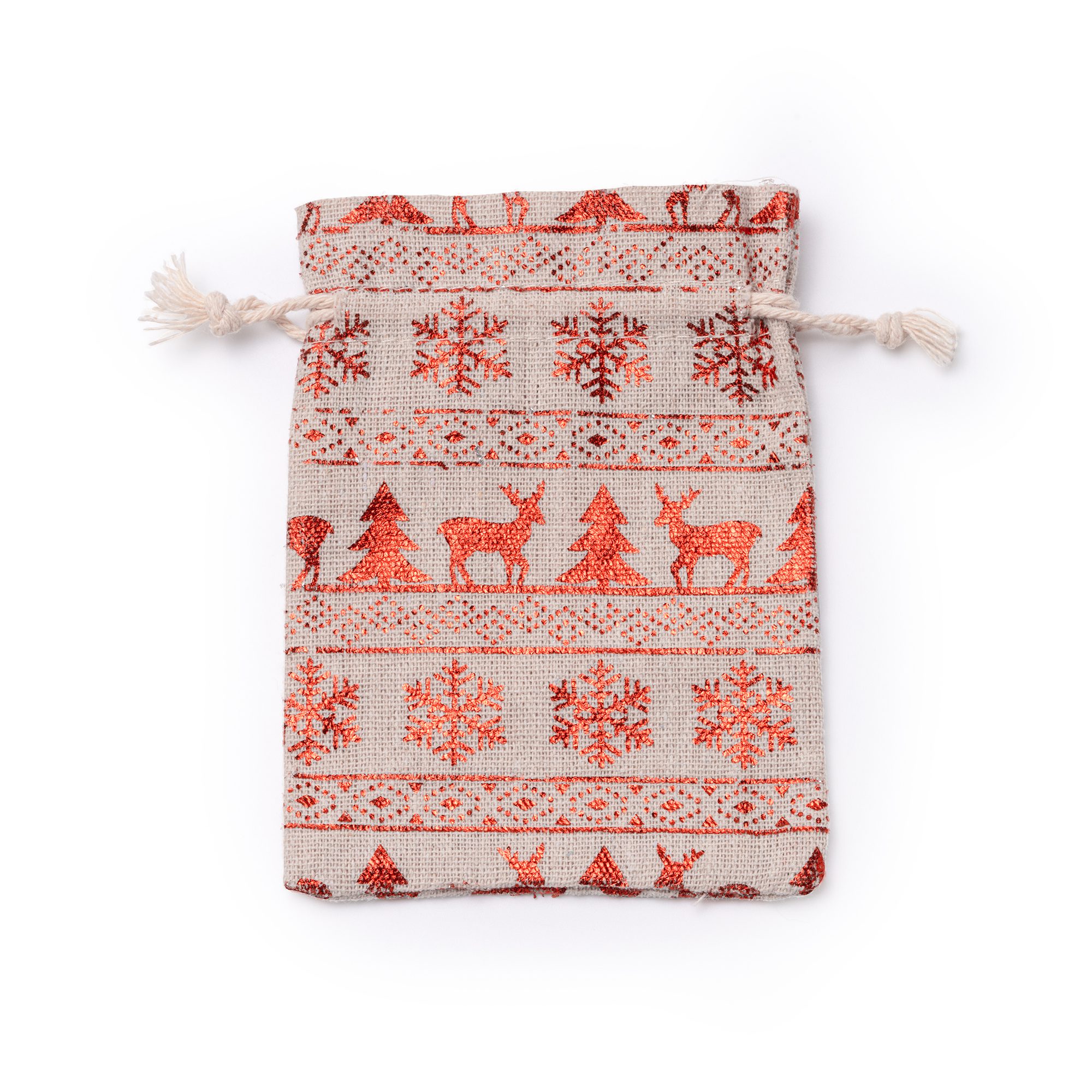 Bolsa para regalo de Navidad estampada con motivos característicos de la temporada, como árboles de Navidad, renos y copos de nieve. La otra cara de la bolsa es lisa especial para impresión. Una alternativa sostenible a los envoltorios de papel desechables, ya que se pueden reutilizar.