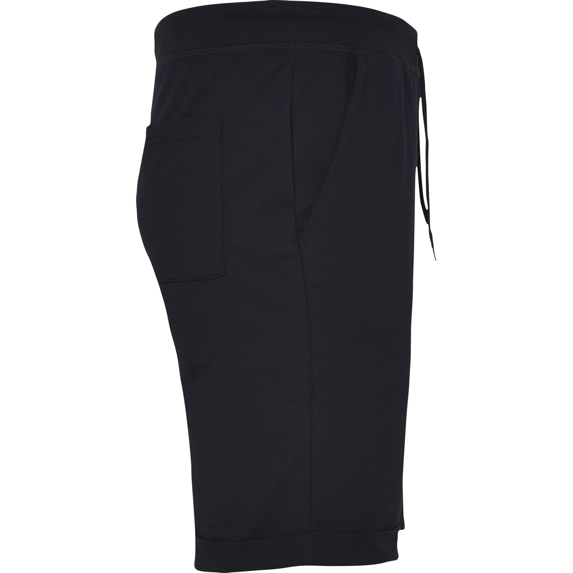 Pantalón corto deportivo básico felpa no perchada. Cintura engomada y cordón ajustable con ojales metálicos. Bolsillos laterales y uno trasero. Dobladdillo en bajos casual.