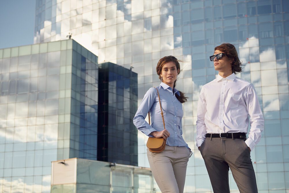 Camisa elástica de manga larga. Puños ajustables con botones. Versión masculina con bolsillo frontal en el pecho. Canesú en espalda.