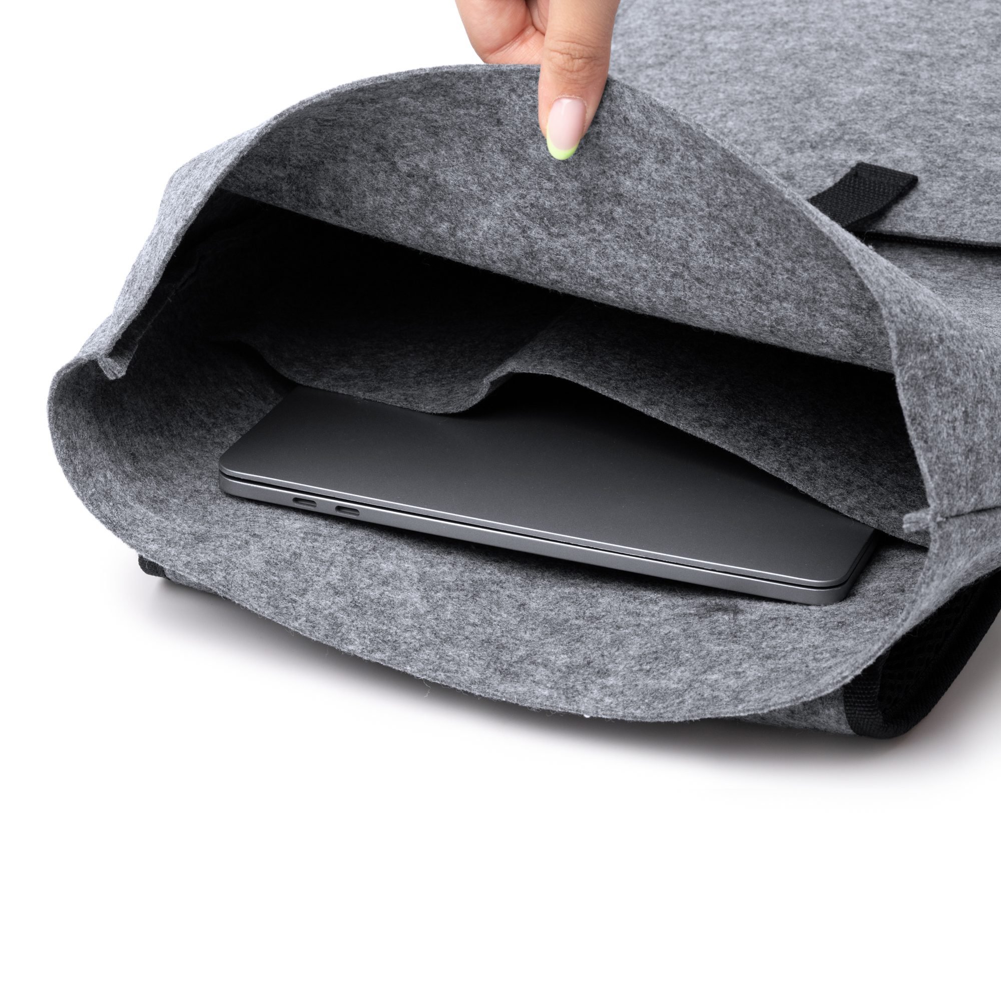 Mochila con solapa elaborada en fieltro reciclado. Cuenta con mosquetón para cierre del compartimento principal, bolsillo frontal para guardar pequeñas pertenencias y asas ajustables.