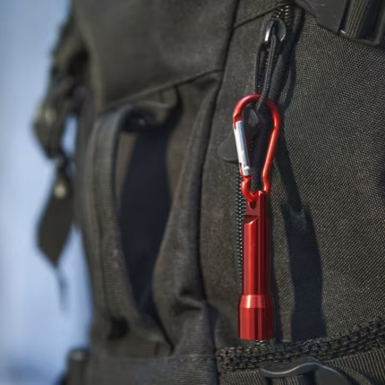 PRODUCTO QUE SE DESCATALOGARÁ CUANDO SE AGOTEN LAS EXISTENCIAS – Linterna con 1 luz LED a pilas. Disponible en varios colores metalizados con mosquetón de transporte a juego.