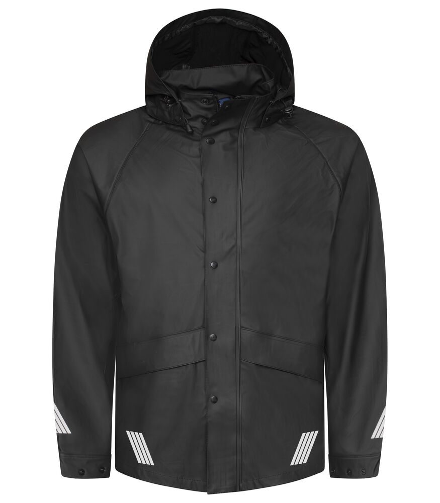 Chaqueta con costuras selladas para ser resistente a agua. Capucha extraíble y puños ajustables con botones a presión. Bolsillos frontales con solapa. Detalles reflectantes en la parte trasera, puños y cintura para una mayor visibilidad