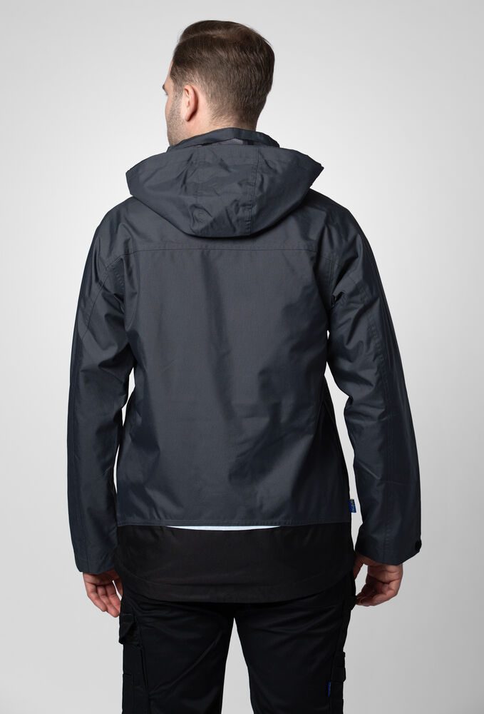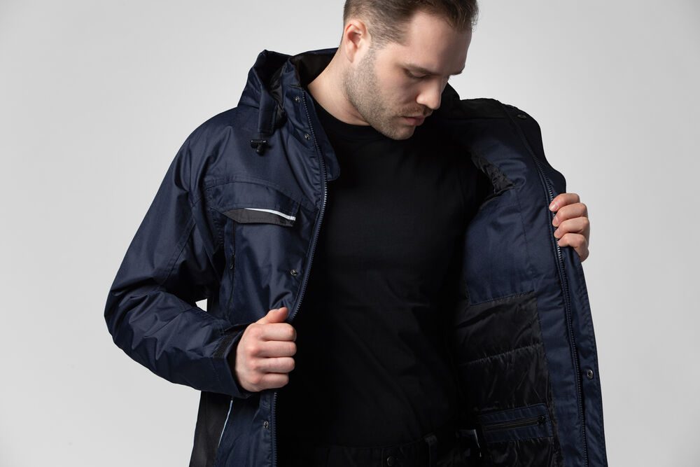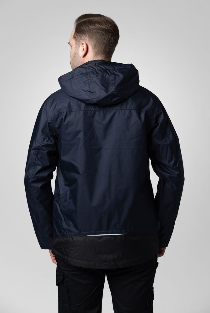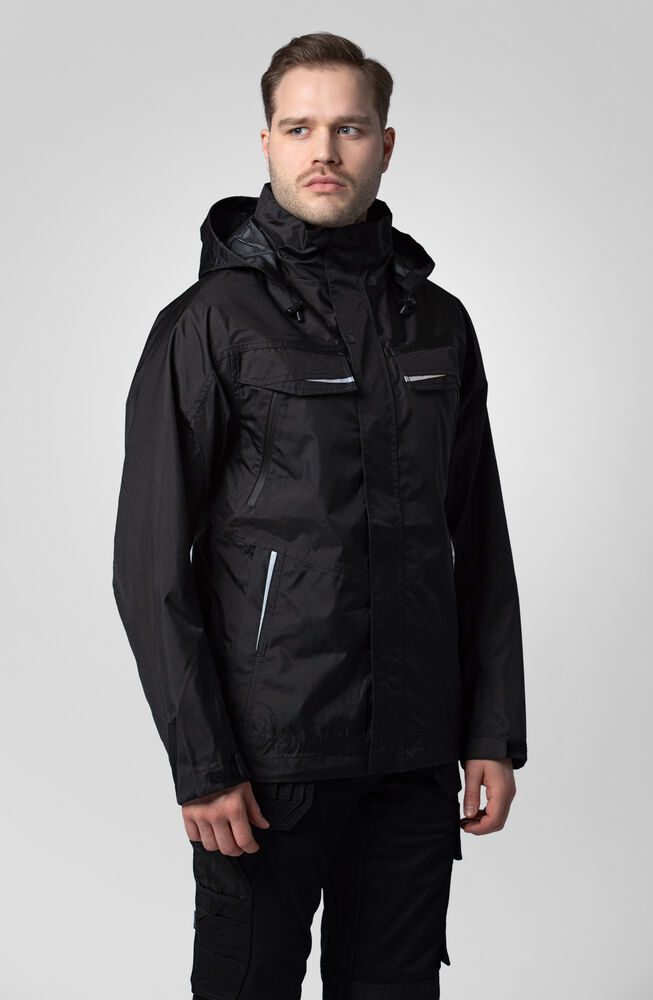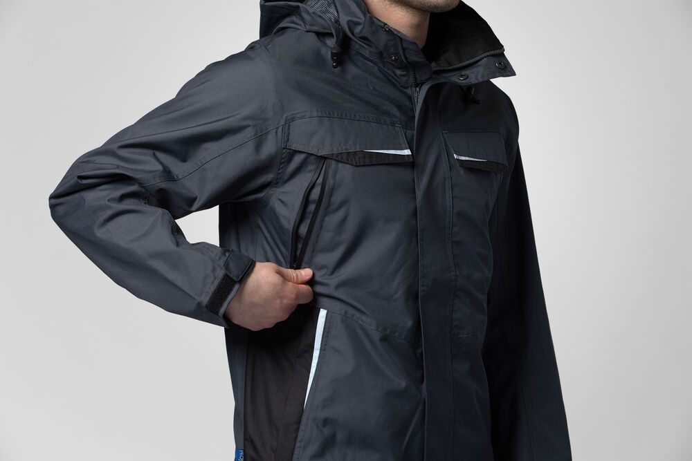 Chaqueta acolchada resistente a viento y agua con costuras selladas. Cremallera frontal con solapa para prevenir que penetre agua, cierre a presión. Bolsillos dobles frontales, dos con solapa y Velcro y dos con cremalleras resistente a agua. Parte izquierda preparada para tarjeta identificativa. Bolsillos laterales con cremallera y forro polar. Tres bolsillos interiores espaciosos, dos con cremalleras. Capucha ajustable con cordón, extraíble. Puños ajustables con Velcro, y cintura ajustable con cordón. El forro puede abrirse fácilmente y facilitar el bordado o cualquier printing.
