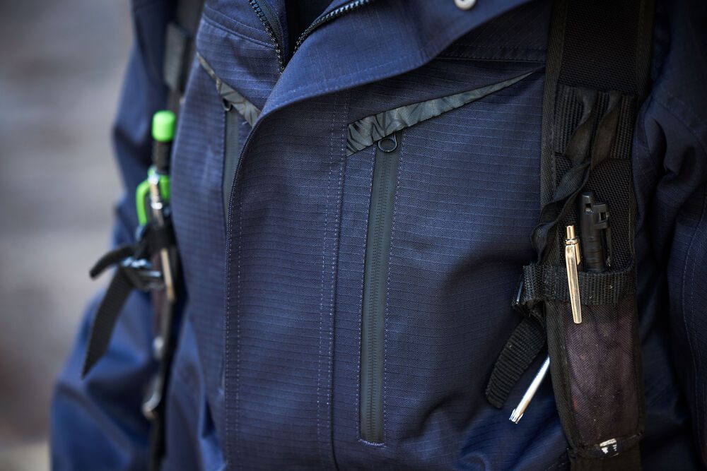 Cazadora cortaviento e impermeable con costuras selladas, confeccionada en material rip-stop. Cremallera bidireccional en la parte delantera con solapa para evitar corrientes de aire y filtraciones de agua, cierre con botones automáticos. Bolsillos de pecho a ambos lados con cremallera, el izquierdo con soporte interno para tarjeta de identificación. Bolsillos laterales con cremallera. Bolsillos interiores en ambos lados con cremallera, en el lado izquierdo un bolsillo abierto con cierre de velcro. Capucha desmontable, ajustable en dos sentidos con cordón. Puños ajustables con velcro, también con agarre interno para el pulgar. Dobladillo de la chaqueta ajustable con cordón. El forro se puede abrir para facilitar la impresión.
