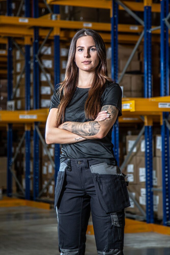 Pantalones de mujer de algodón resistente y refuerzos de Cordura®. Bolsillos desmontables sujetos con raíles ocultos inventados por ProJob, uno con bolsillos adicionales y otro con trabillas para herramientas. Bolsillos en la pierna, en el lado izquierdo bolsillo con solapa y cierre de botón a presión, bolsillo interior para móvil y gancho para tarjeta de identificación. En el lado derecho bolsillo para cinta métrica y bolsillo con botón para herramientas. Bolsillos traseros con anchura extra. Dos trabillas ajustables para martillo. D-Ring en cintura. Bolsillos interiores para protectores de rodilla, ajustables a dos niveles de altura. Los bolsillos para fundas, la parte posterior de los dobladillos de las piernas y las rodillas están reforzados con Cordura® para una mayor durabilidad.