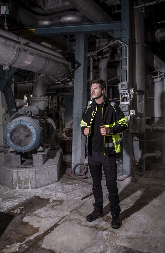 Chaqueta Softshell de gran transpirabilidad. Cremallera entera en la parte delantera con solapa cortaviento interna y protector de cremallera para la barbilla. Bolsillos laterales con cremallera, bolsillo frontal en el lado derecho con gancho interno para sujetar la tarjeta de identificación. Bolsillos interiores. Transfers reflectantes de para mayor flexibilidad. Cintura ajustable con cordón.