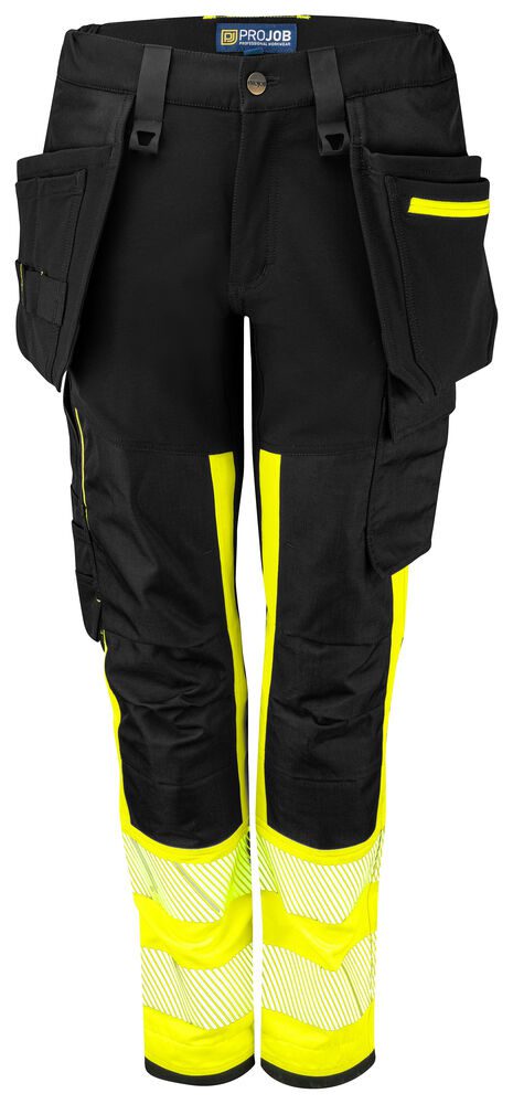Pantalón elástico para una máxima libertad de movimientos. Corte moderno. Elástico en muslos, espalda y laterales para una mayor comodidad. Bolsillos tipo funda con compartimentos adicionales y refuerzo interior de Cordura®; si se desea, se pueden quitar los bolsillos tipo funda descosiendo la costura de contraste de la parte trasera. Amplios bolsillos en pierna a ambos lados. Bolsillo en la pierna izquierda para herramientas y bolígrafos, bolsillo para móvil con cierre magnético y gancho para tarjeta de identificación. En el lado derecho bolsillo para cinta métrica y bolsillo para herramientas con botón. Posibilidad de añadir equipo complementario mediante velcro. Rodillas precurvadas. Bolsillos de protección de rodillas regulables a dos alturas, con apertura desde el interior. Bolsillos tipo funda, bolsillos traseros, y rodillas (hasta los muslos) reforzados en Cordura® para una mayor durabilidad. Segmentos reflectantes 3M. Deshaciendo la costura roja del dobladillo, el pantalón puede alargarse 5 cm.