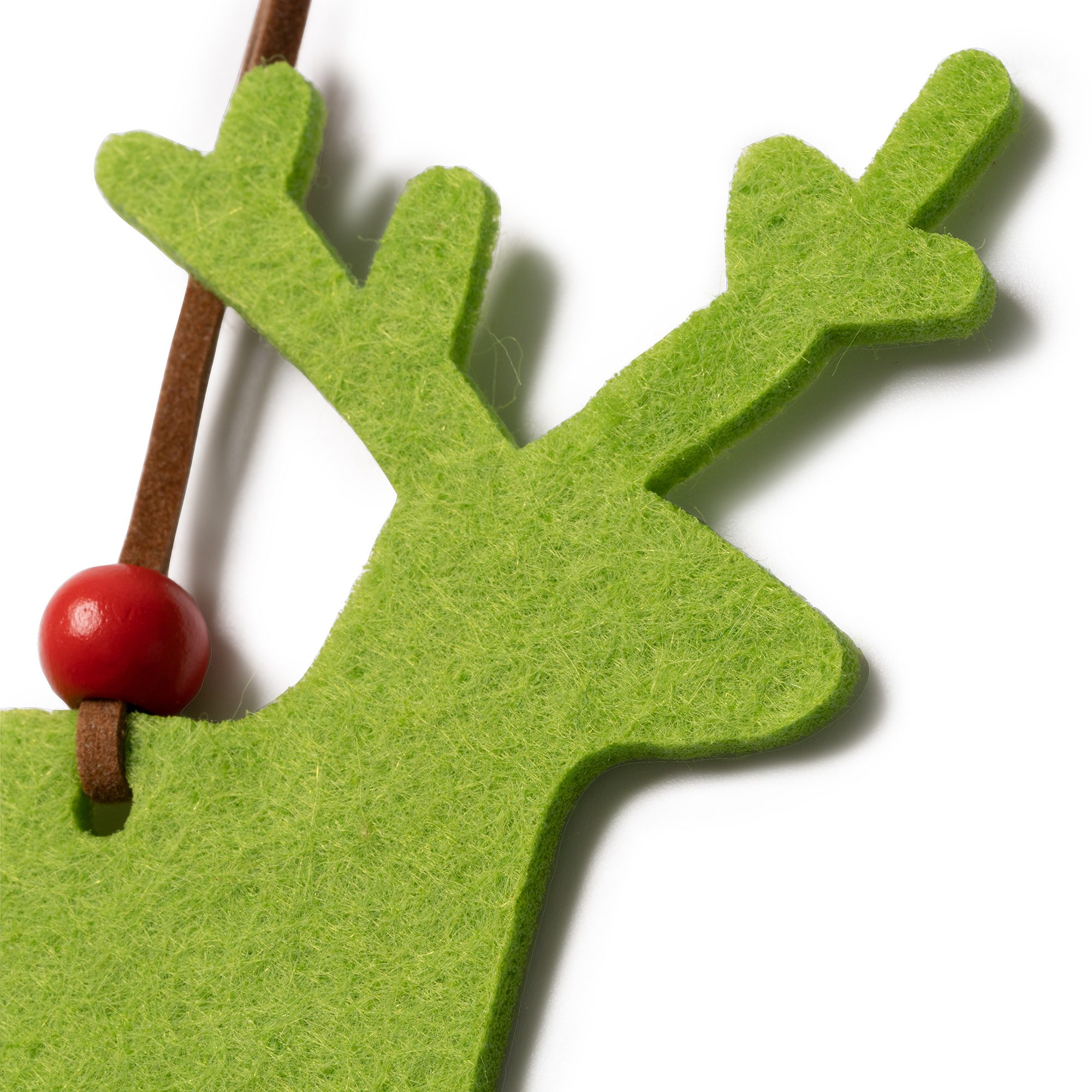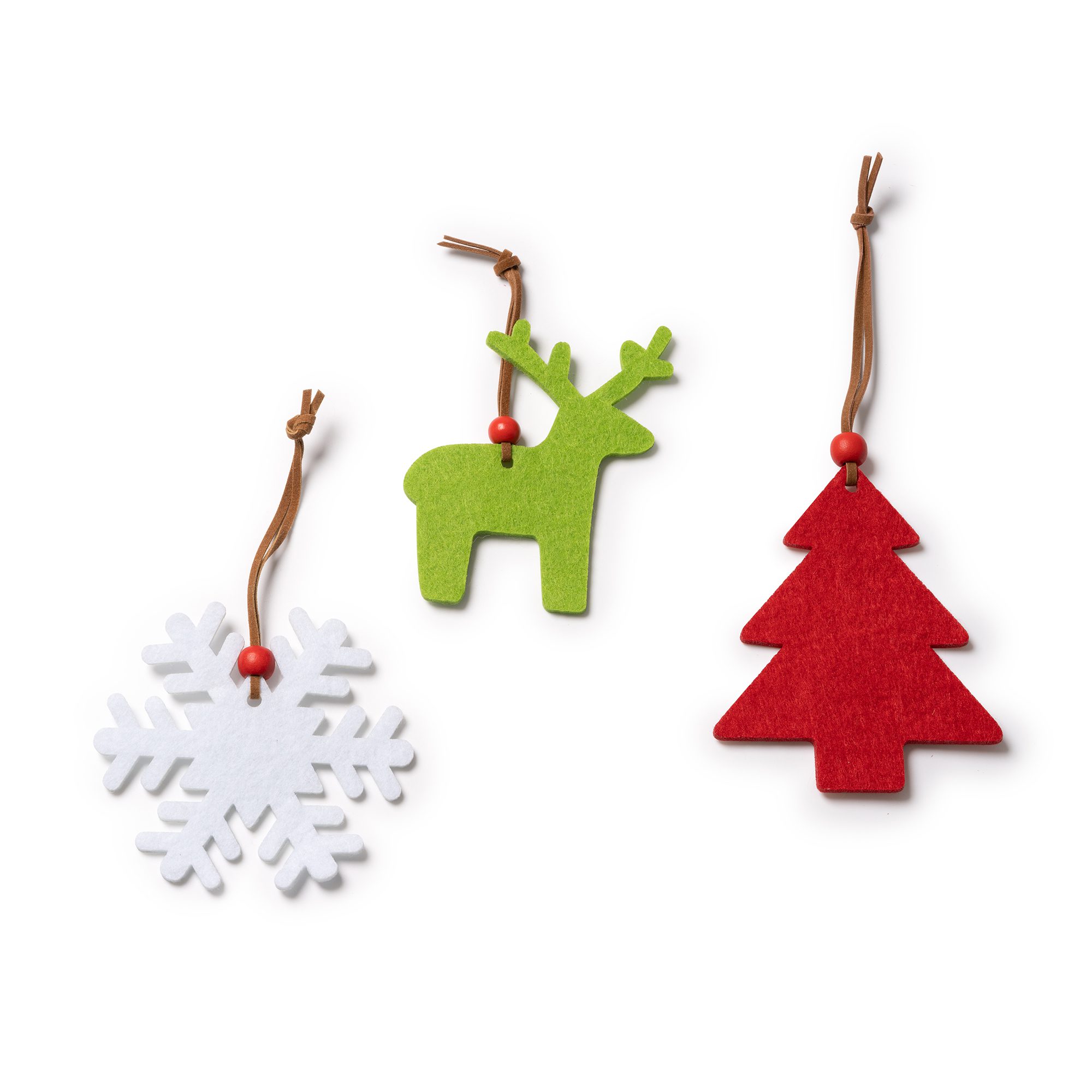 Adorno navideño de fieltro. Disponible en tres diseños: copo de nieve, árbol y reno. Todos los diseños se presentan con cordel marrón y cuenta roja en su extremo.
