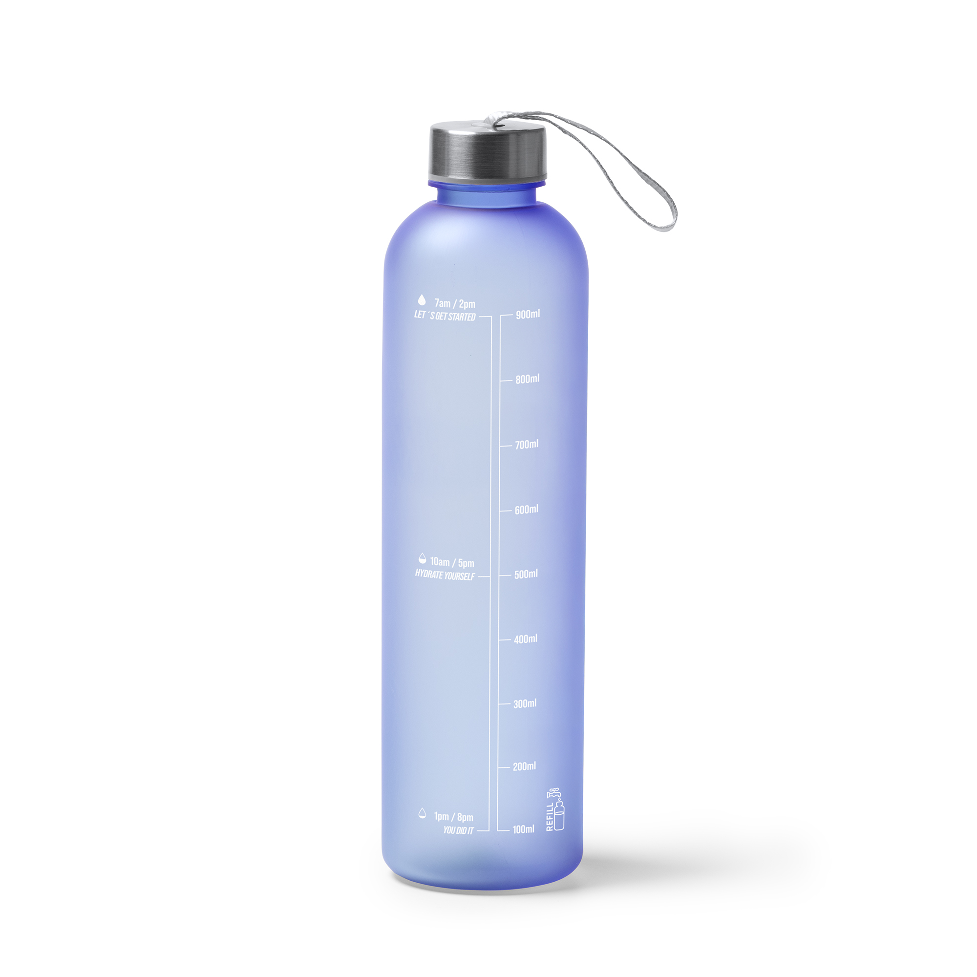 Bidón de tritán con cuerpo translúcido, con capacidad para 1L. Cuenta con tapón con cierre a rosca y asa de transporte integrada en él. Incorpora recomendación de hidratación e indicador de capacidad en el cuerpo. Una opción práctica, ligera y funcional.